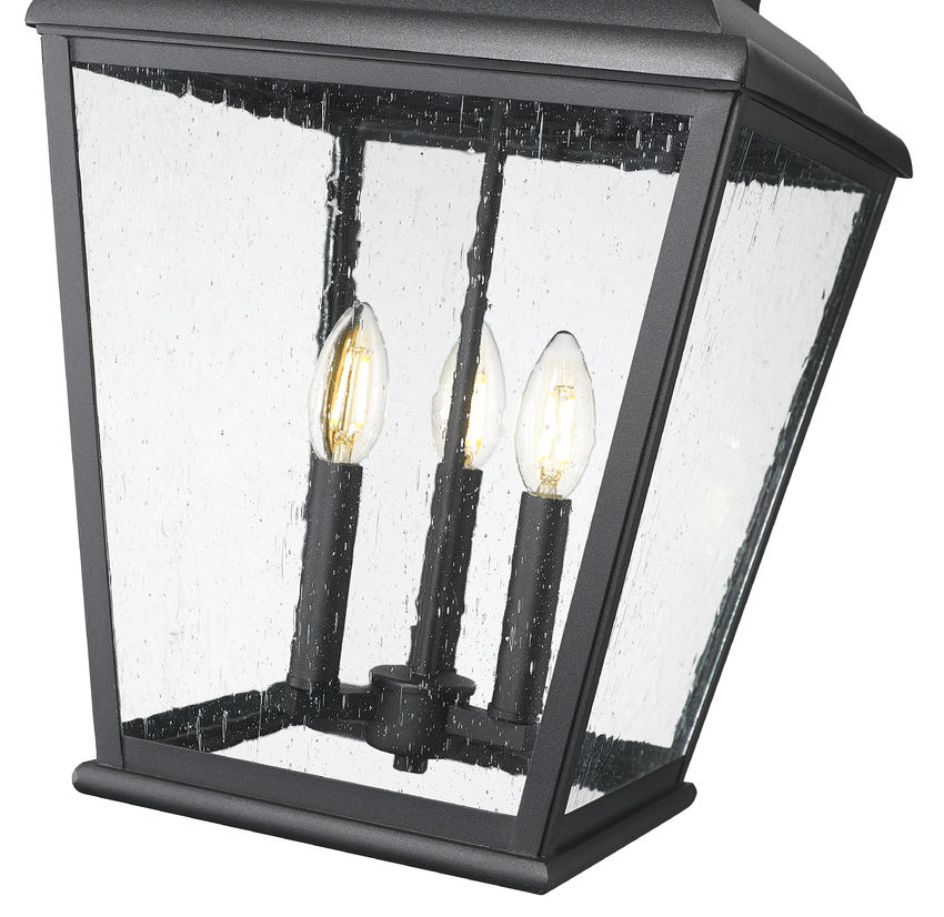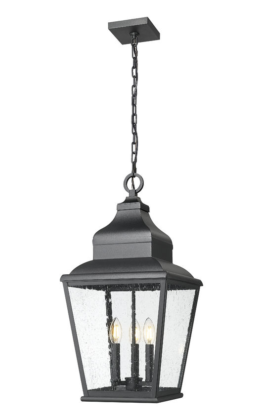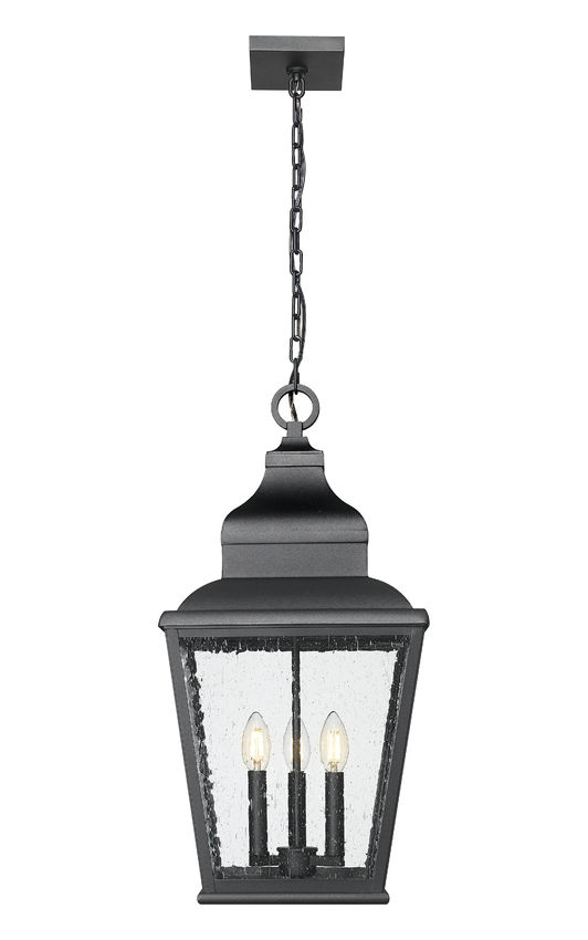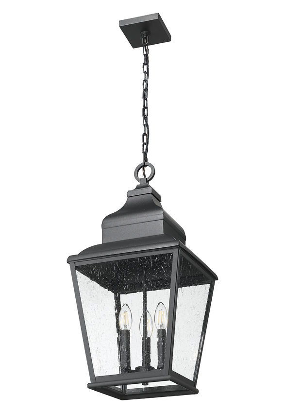 A lantern motif begins stylish design elements in a three-light outdoor chain mount ceiling fixture ideal for covered patios and pool house settings. Embrace soft sand black finish aluminum tapered framing, with clear seedy glass panels revealing romantic candelabra-style interior bulb mounts. This timeless outdoor ceiling light delivers adjustable lighting levels with coveted dimming features.