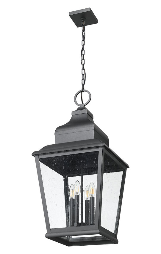 Plenty of strong illumination originates from this four-light outdoor chain mount ceiling fixture, a superb choice for customizing lighting on covered porches, back patios, and outbuildings. A softly bold sand black finish coats aluminum framing with a tapered silhouette and excess detail delivering style. Clear seedy glass panels reveal interior candelabra-style light bulb mounts that invite bulbs and offer light levels through dimming features.