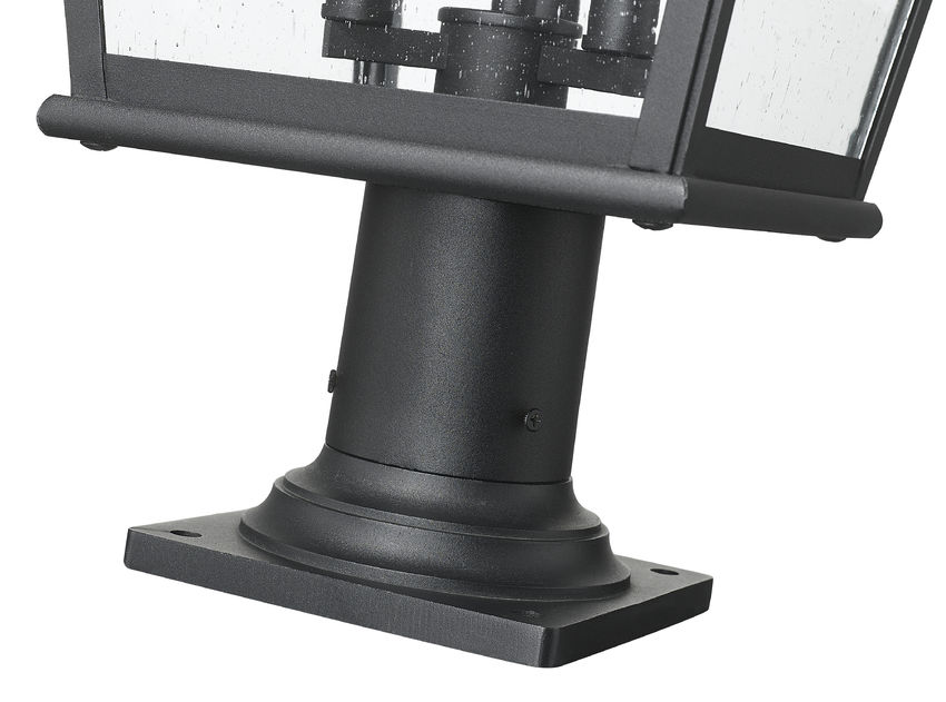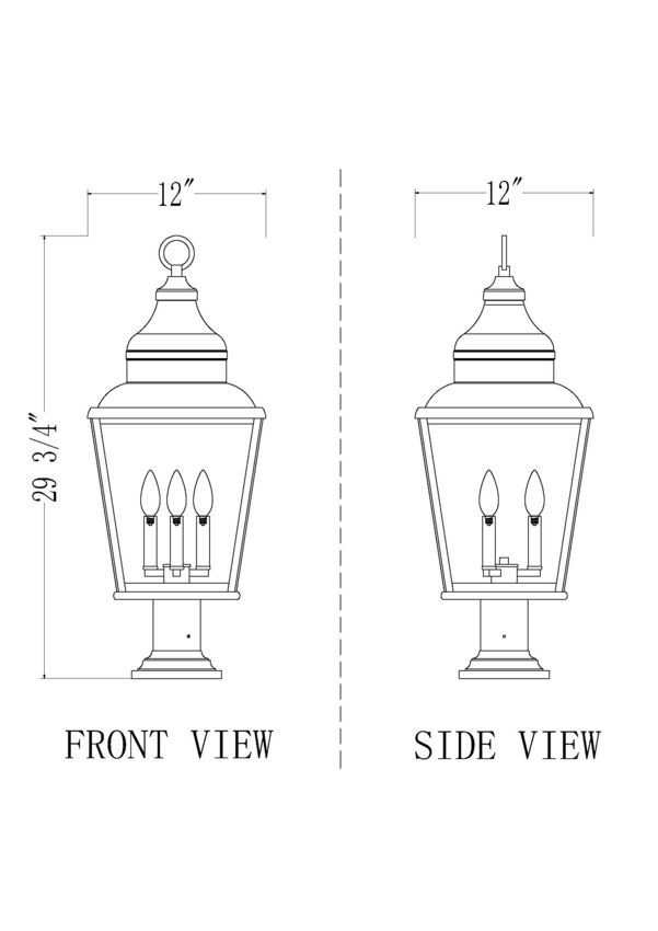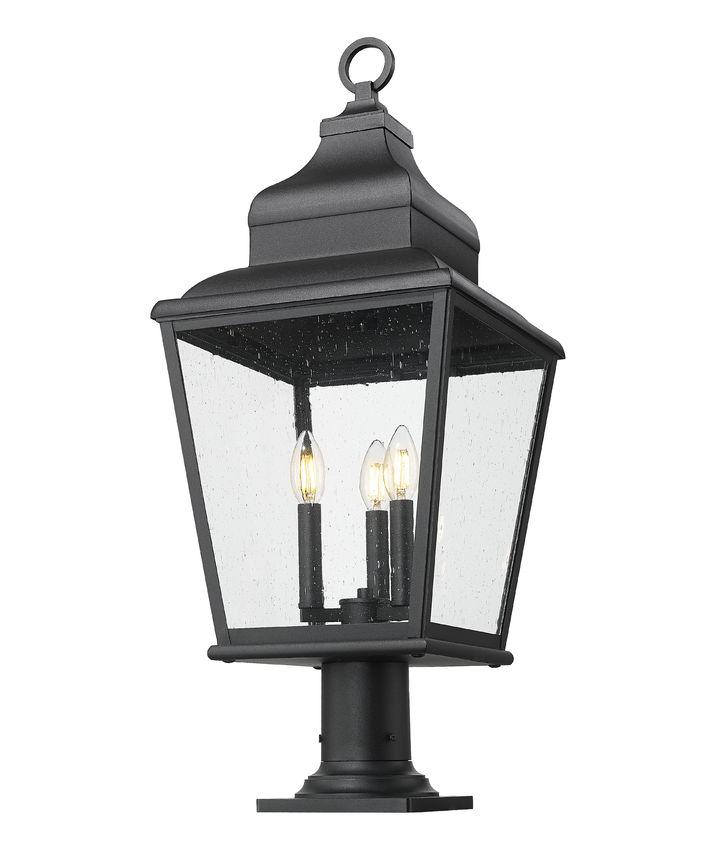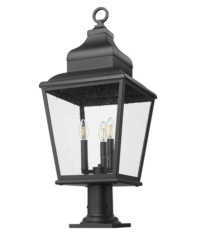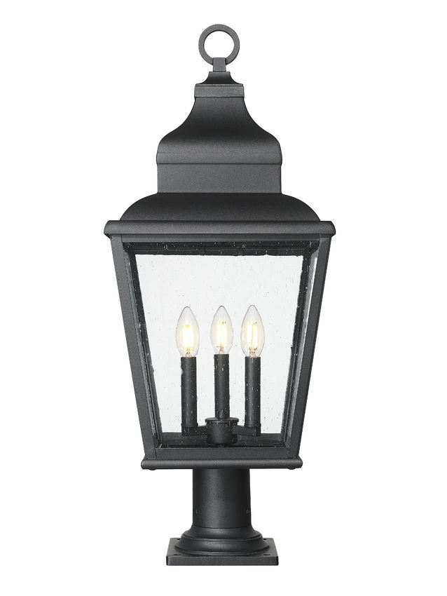 Gardens, landscaped areas, and yard spaces welcome this three-light outdoor pier-mounted fixture, an iconic version of classic lantern aesthetics. Dressed up with ornate detail, this elegant light features clear seedy glass panels offering a full view of interior candelabra-style holders. Dim lighting to create mood effects.