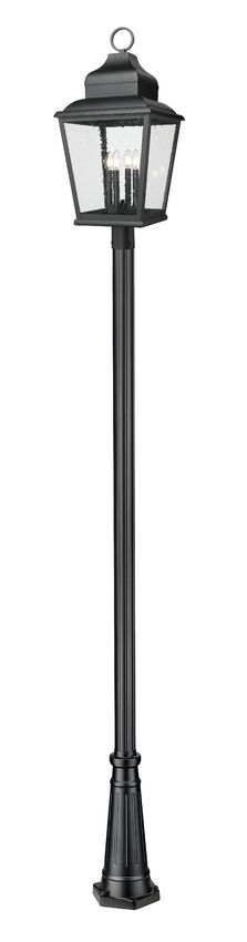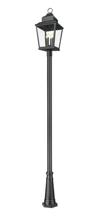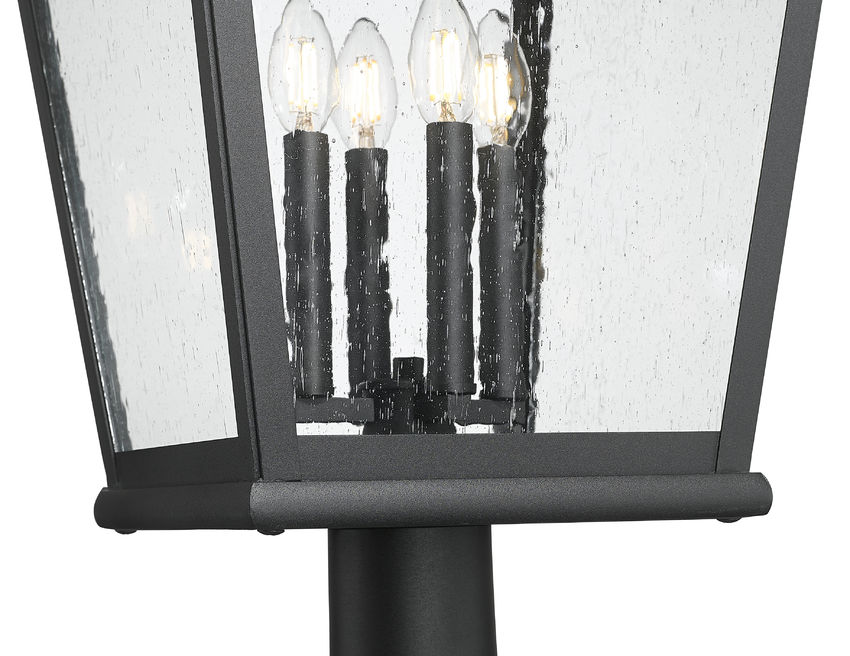 Choose this four-light outdoor post mount fixture for maximal illumination in a large yard space or pathway. Made of sand black finish aluminum, its lantern-inspired framing is treated to ornate accenting, with clear seedy glass panels infusing a bit of romance. Interior candelabra-style bulb holders glow with lighting that's dimmable to conform to round-the-clock conditions.