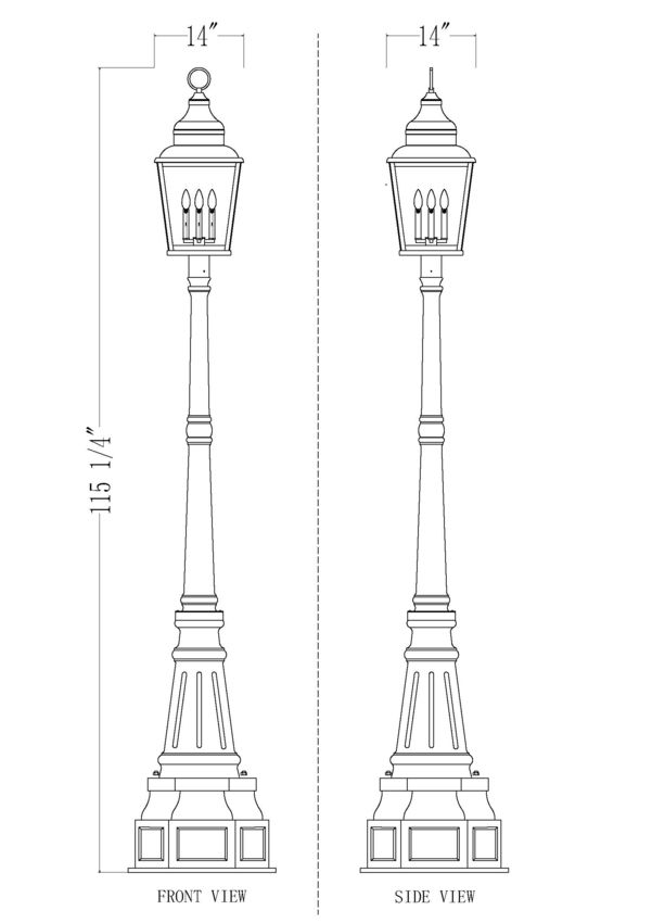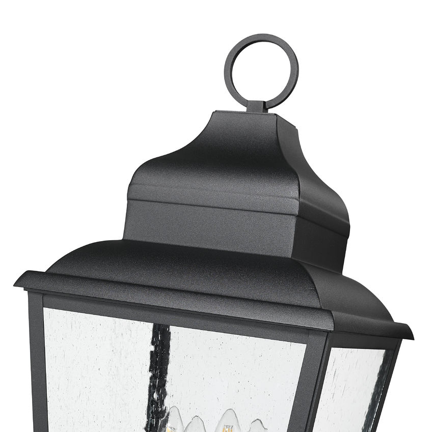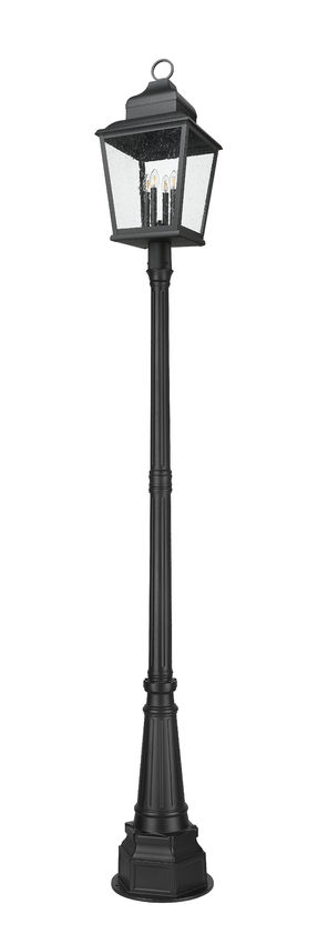 Choose this four-light outdoor post mount fixture for maximal illumination in a large yard space or pathway. Made of sand black finish aluminum, its lantern-inspired framing is treated to ornate accenting, with clear seedy glass panels infusing a bit of romance. Interior candelabra-style bulb holders glow with lighting that's dimmable to conform to round-the-clock conditions.