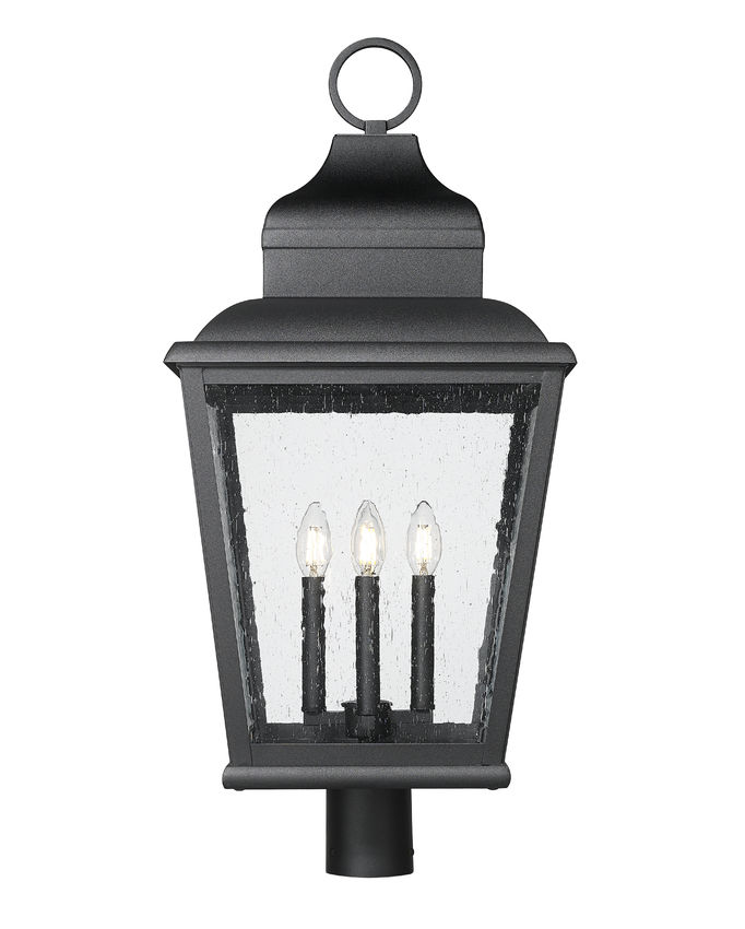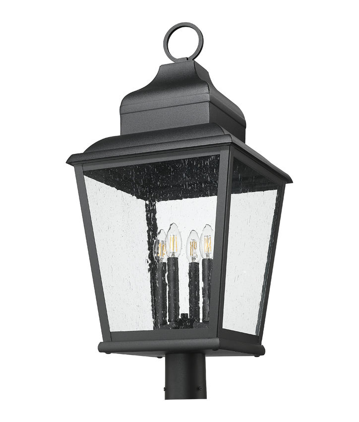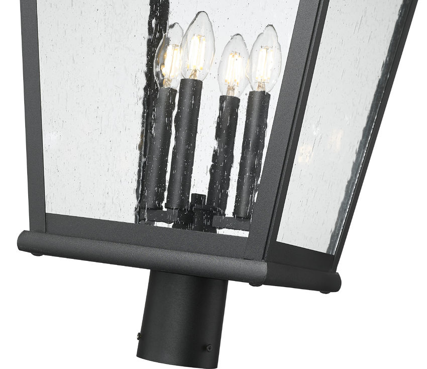 Romantic with a village aesthetic, this four-light outdoor post-mount fixture brings a romantic personality as it illuminates yards and garden spaces. A soft sand black finish over aluminum construction highlights ornate detail, with a lantern-like silhouette and clear seedy glass panels creating an enticing look. Clustered candle holders softly glow with dimmable lighting, perfect for meeting illumination needs around the clock.