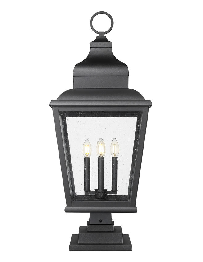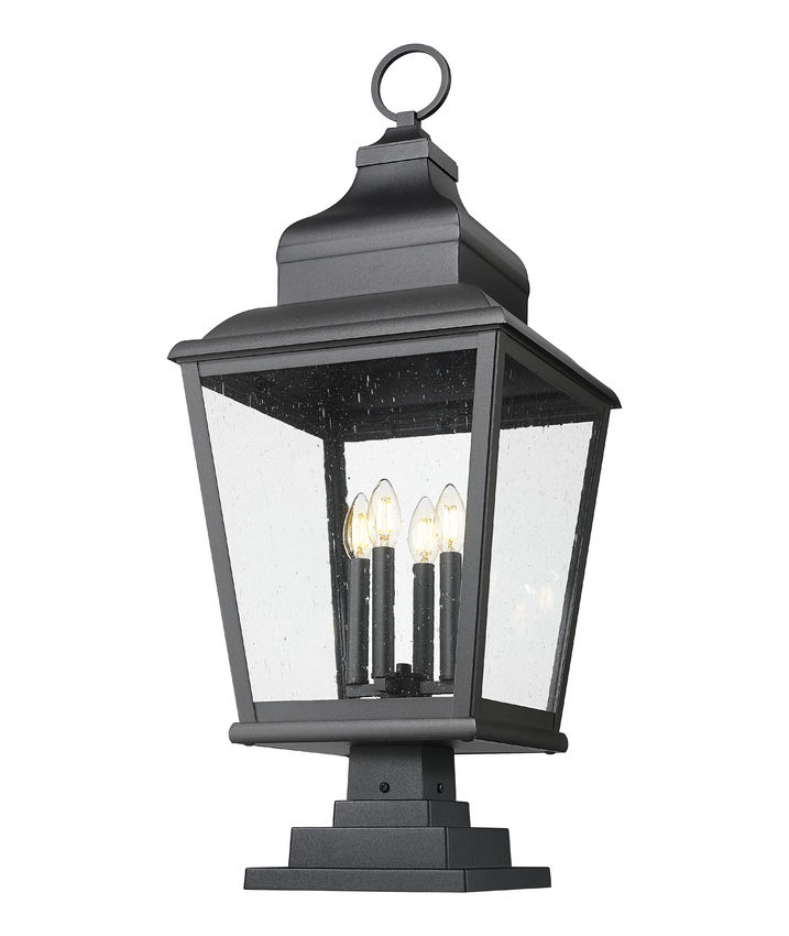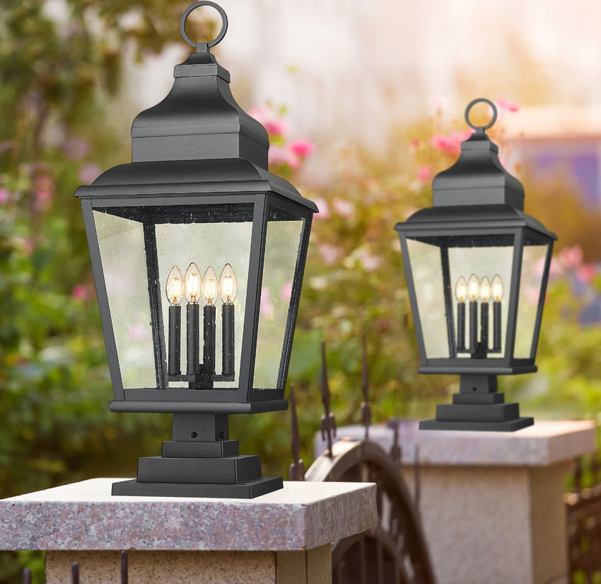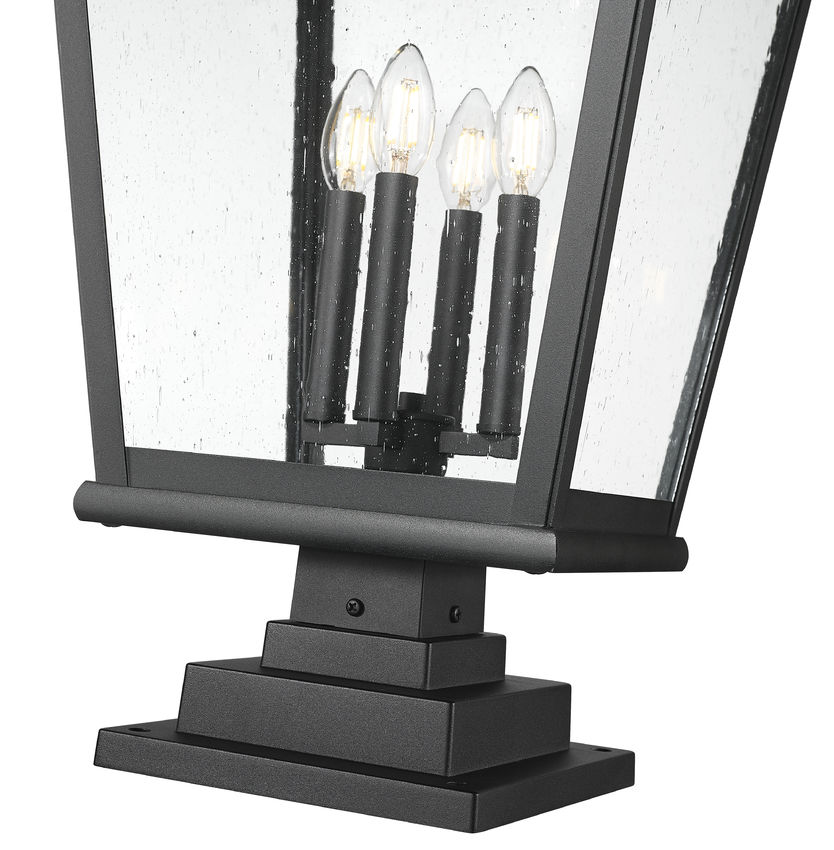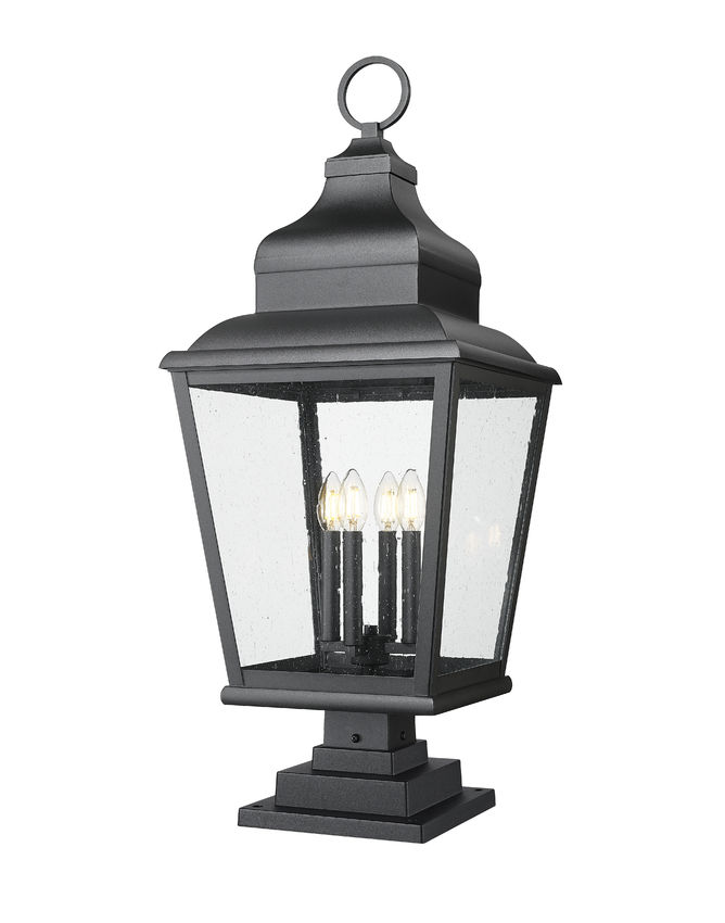Note the rich detail embellishing the lantern-inspired motif of this four-light outdoor pier mounted fixture, an iteration originating from village fare. Sand black finish aluminum framing includes a tall roof with decadent accents, a tapered silhouette, and clear seedy glass panels partly shielding dimmable light from a clustered collection of candelabra-inspired holders. Make this pier mounted fixture part of a custom garden area or walkway.