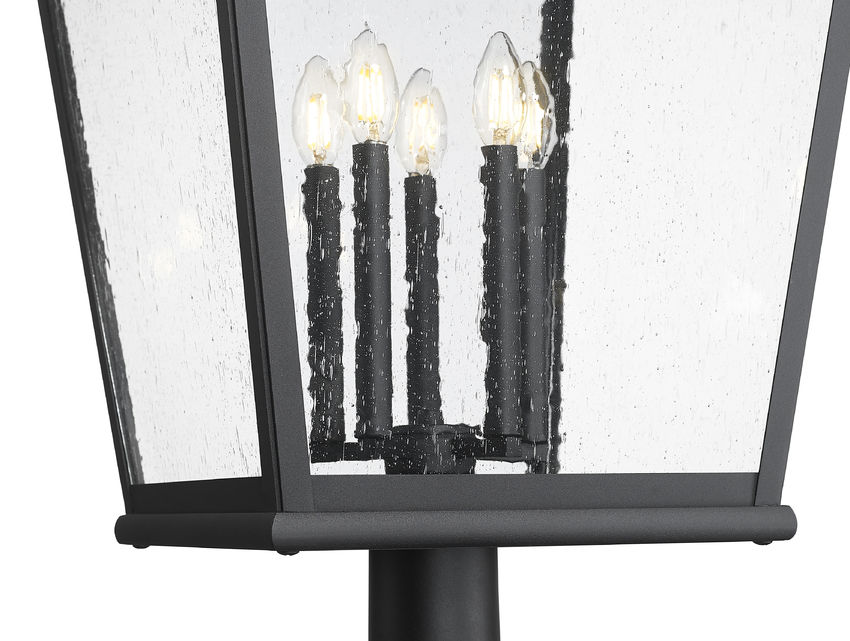 A twist on iconic lantern-inspired design, this five-light outdoor post mount fixture enhances residential or commercial exterior settings with a village motif. Sand black finish aluminum crafts a tapered frame with a tall, detail-rich roof, as clear seedy glass panels inspire with a bit of romance. Candelabra-style holders reflect a romantic ambience in a dimmable light perfect for round-the-clock illumination.