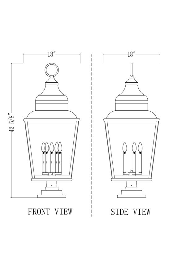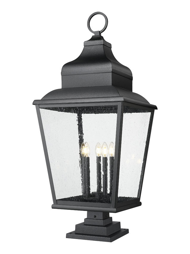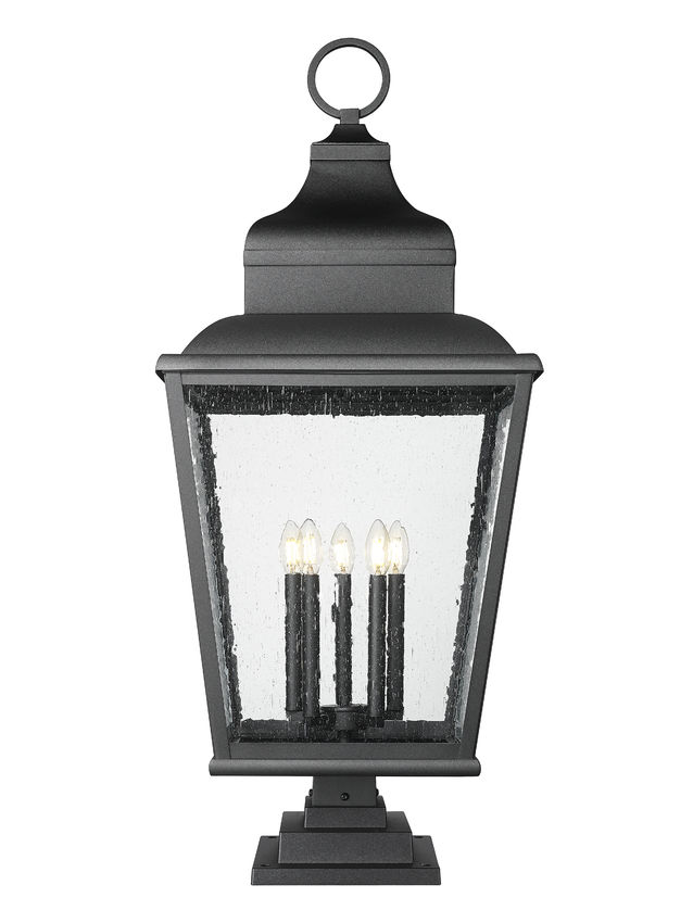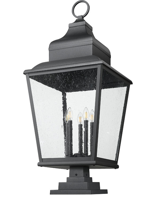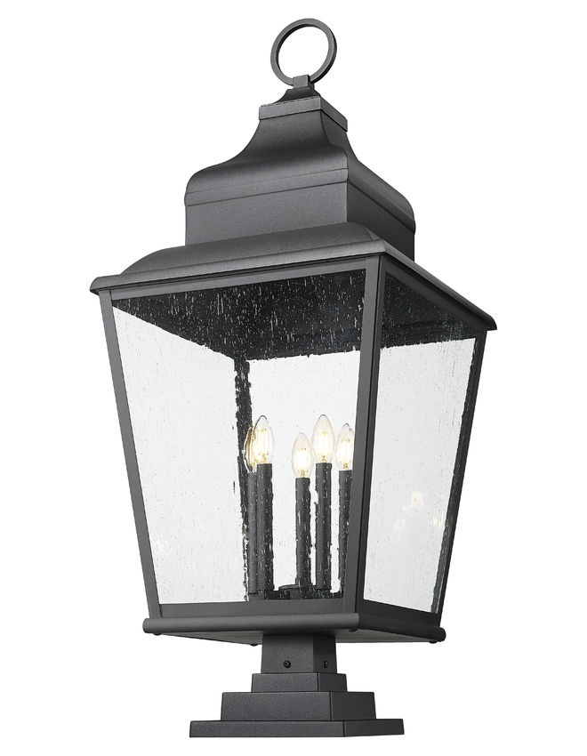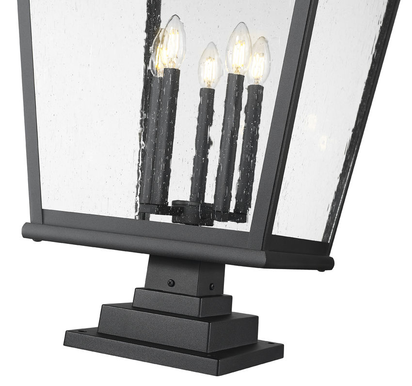 Taking a page from the timeless lantern motif, this five-light outdoor pier-mounted fixture makes itself at home in residential or commercial settings. Its soft sand black finish aluminum frame features rich roof detailing, elegant and inspired, with clear seedy glass panels offering a view of interior candelabra lighting. Use dimming features to create mood lighting or to adjust to time-of-day needs.