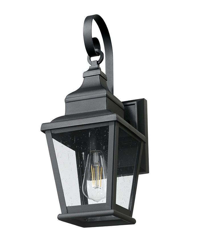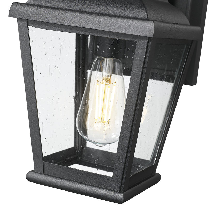 An outdoor wall light with sleek style is what your residential or commercial structure needs, and this sand black finish aluminum version is decked out with elegant detail. Light up a porch, back deck, or outbuilding with a lantern-inspired fixture featuring a tall roof, tapered body, and clear seedy glass panels adding a weathered appearance. Dimming functions embellish this light fixture by offering customizable light levels.