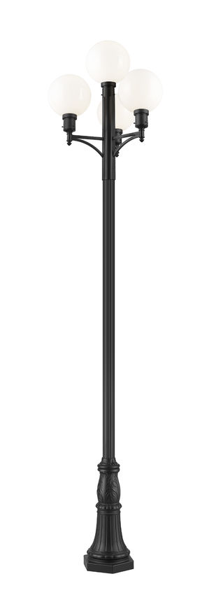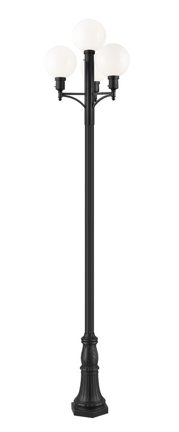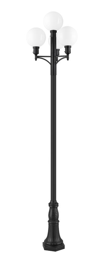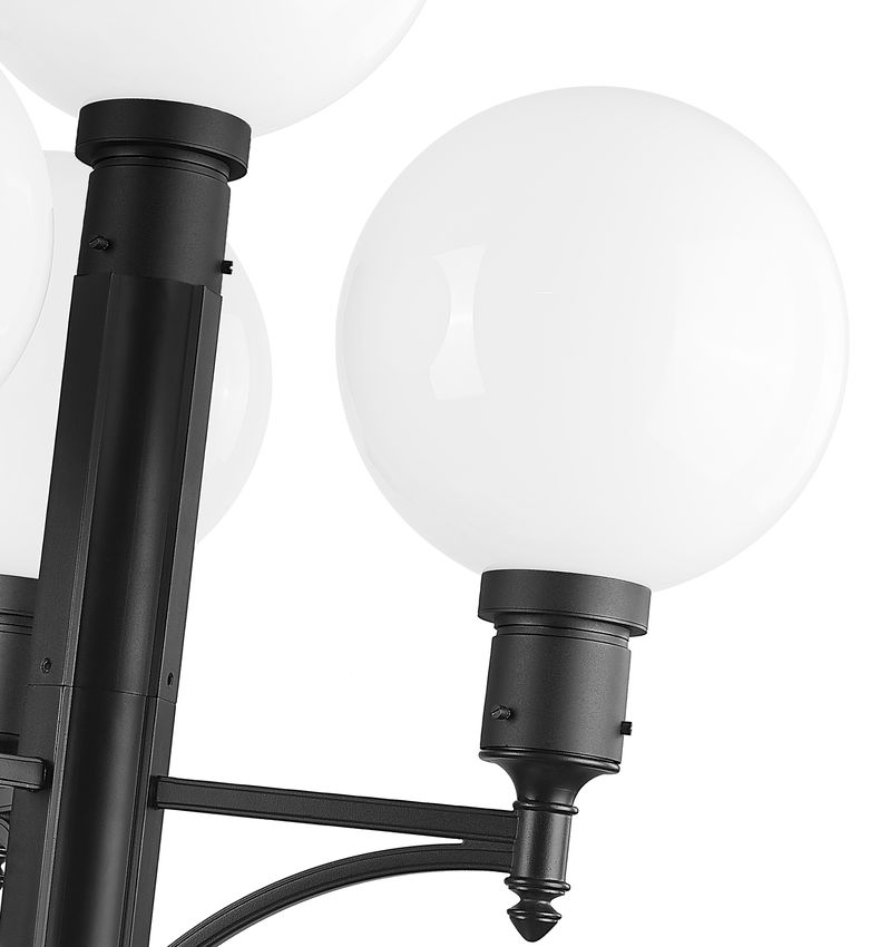 This four-light outdoor post mount fixture from the Laurent collection embodies the whimsical creativity famous in Mid-Century Modern designs. Emulate a retro feel in a front yard or walkway with this epic light fixture fashioned of versatile black finish aluminum in a simple yet sophisticated base. A charming opal glass globe shade steals the show with artistry and festivity.