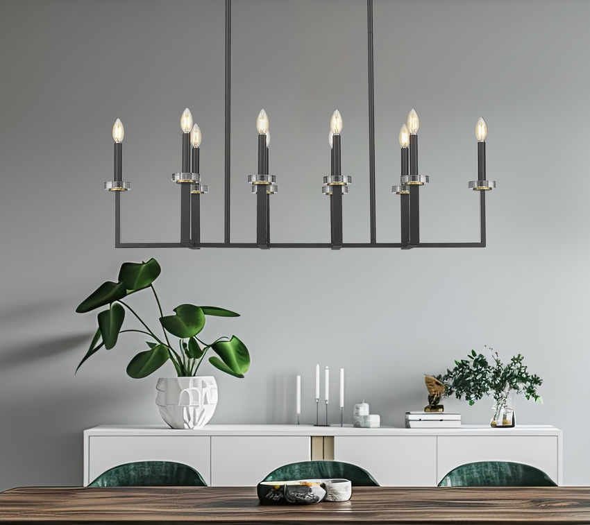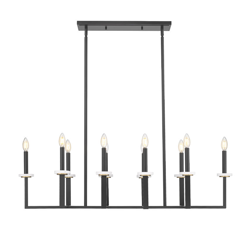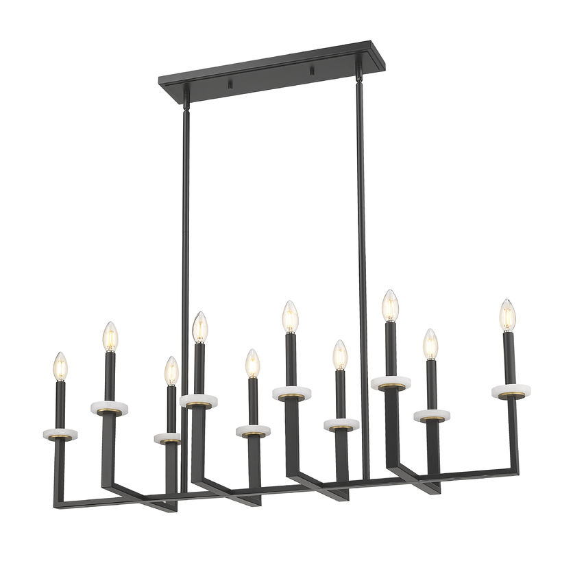 Linear and perpendicular silhouetting shows up to create a striking look to this ten-light linear chandelier, a superb option for illuminating kitchen islands, dining ensembles, or bar spaces. Matte black finish steel construction offers a busy design with U-shaped dual bars set on a single frame, each supporting candelabra-style bulb mounts. Elegant boboches bring an artisan flavor to this dimmable fixture allowing for mood-lighting and extra illumination as needed.