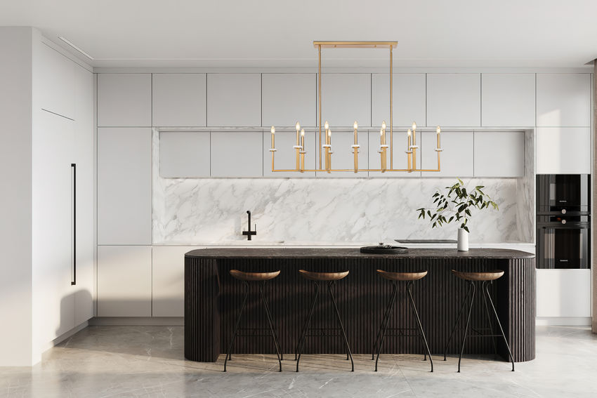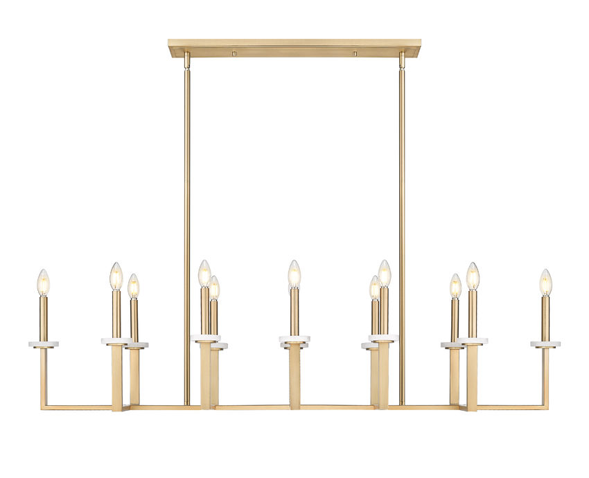 The illumination power of this twelve-light modern gold steel chandelier is second only to its impressive design featuring a perpendicular arrangement of u-shaped holders and a single bar. A superb choice for kitchen islands, dining rooms, and foyers, this fixture delivers strong lighting from candelabra-style bulb mounts accented with charming boboches. Dimming options create disparate lighting levels, ideal for time-of-day differences.