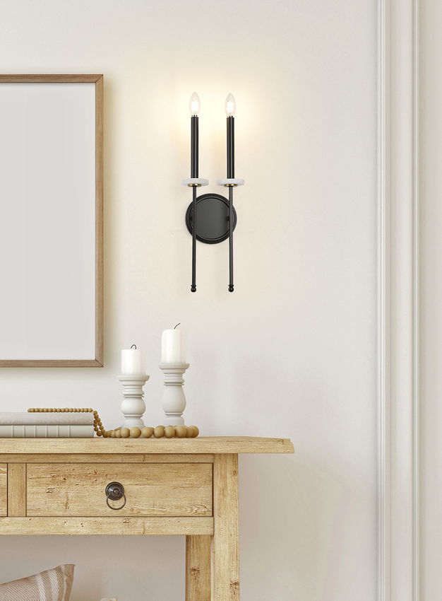 A seamless design reflects on timeless style in a two-light wall sconce crafted of matte black finish steel. Elegant lines stand out in elongated arms and tall candelabra bulb bases, adorned with charming boboches that really make an impact. This dual light fixture delivers variable light levels with its convenient dimming function, perfect for mood lighting in living rooms, hallways, and bedrooms.