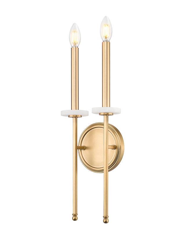 A warm, rich feel comes from the modern gold finish steel framing of a two-light wall sconce making itself indispensable in contemporary living rooms, hallways, and bedrooms. Slender in silhouette, its side-by-side elongated stems with decorative boboches create an organic look, with candelabra bulb mounts and dimmable lighting levels deliver an exquisite look with functionality.