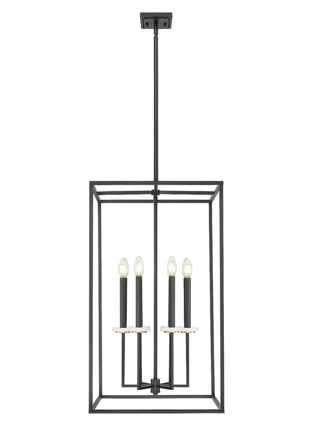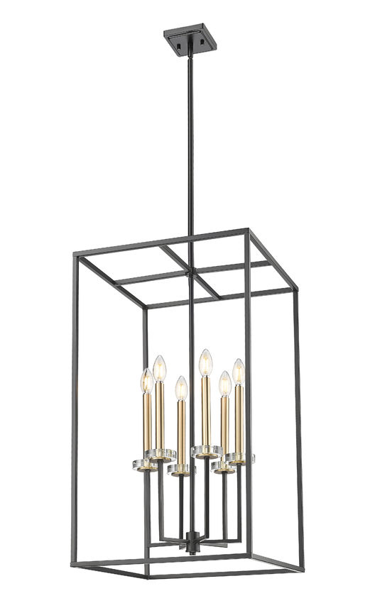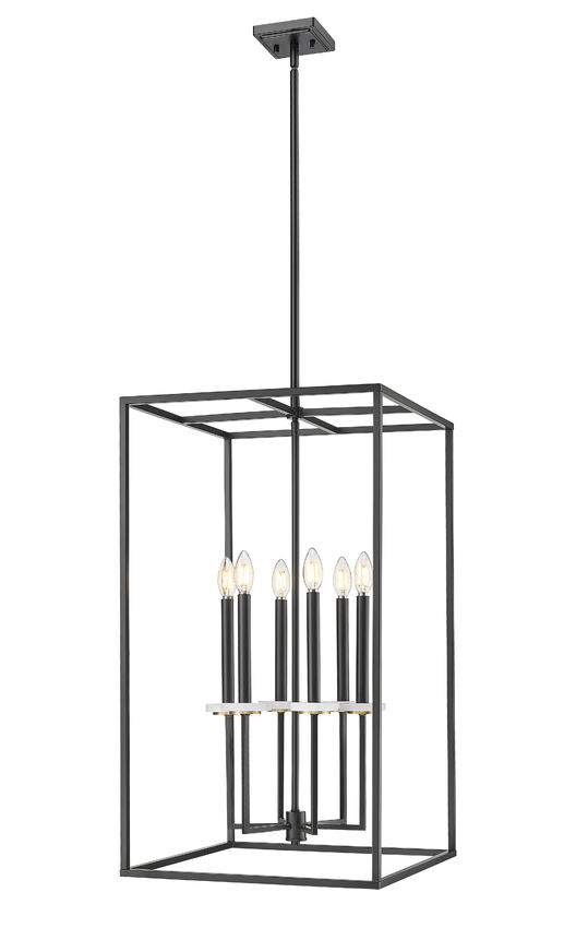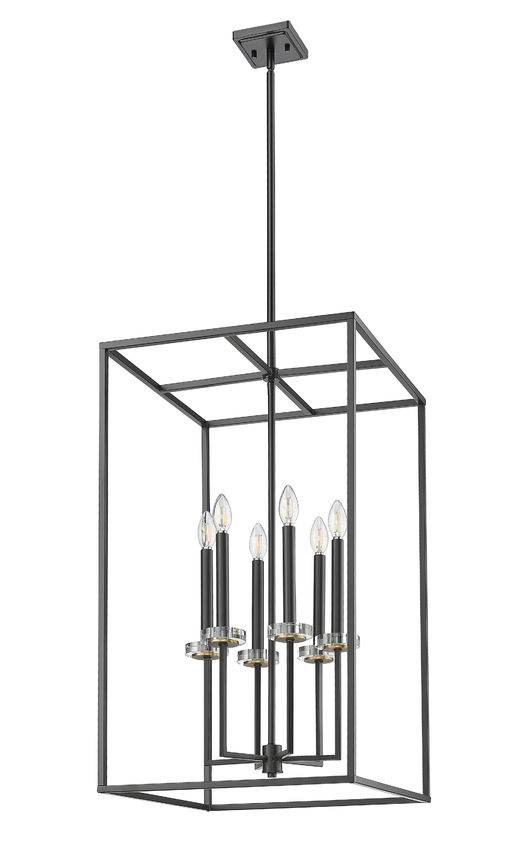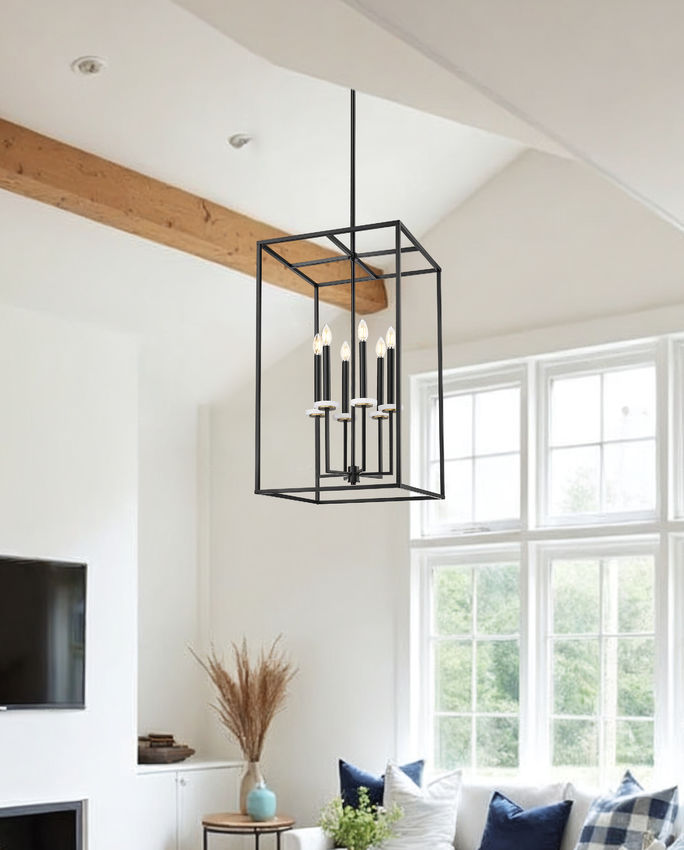 Bold matte black finish steel framing constructs an open metalwork cage design as this six-light chandelier creates welcoming style in living rooms, dining rooms, and foyers. A tall, rectangular silhouette is perfect for more narrow settings, as dimmable lighting flows from candelabra bulb holders dressed up with charming boboches.