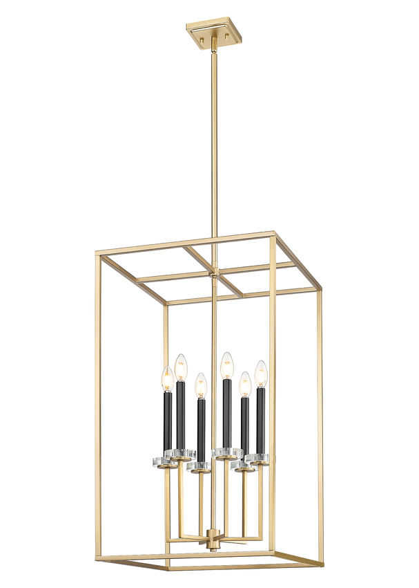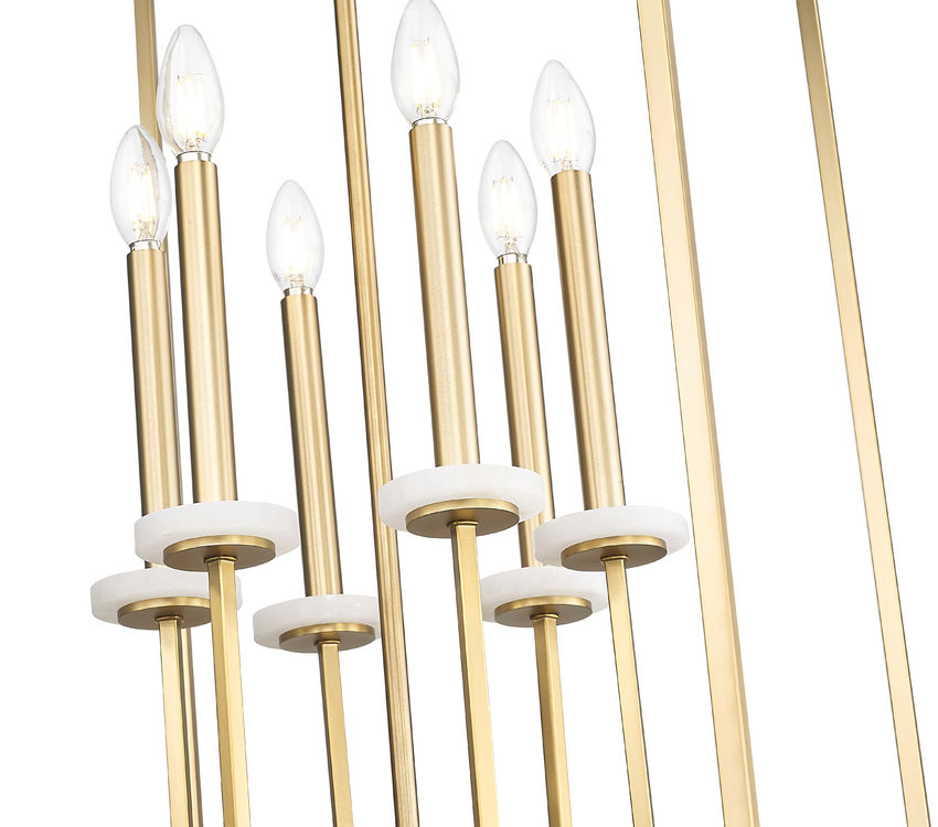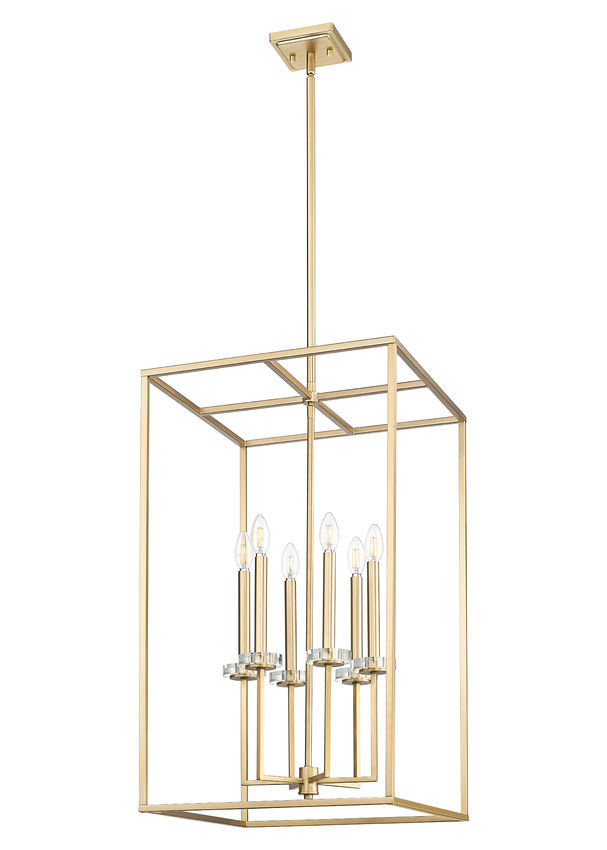 A multi-motif design adds versatility for illumination of sophisticated living spaces as this six-light chandelier emulates a version of open metalwork cage styling. Warm modern gold finish steel construction embraces a geometric silhouette, with internal candelabra holders and dimmable lighting ideal for setting moods and adjusting to time-of-day needs.
