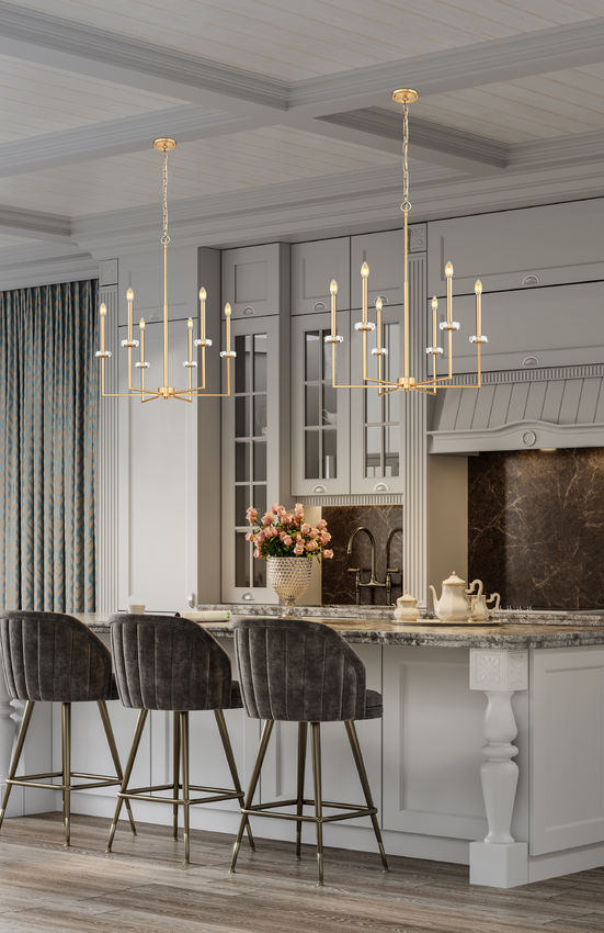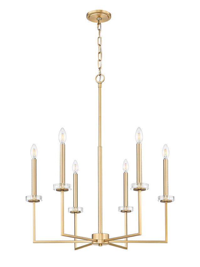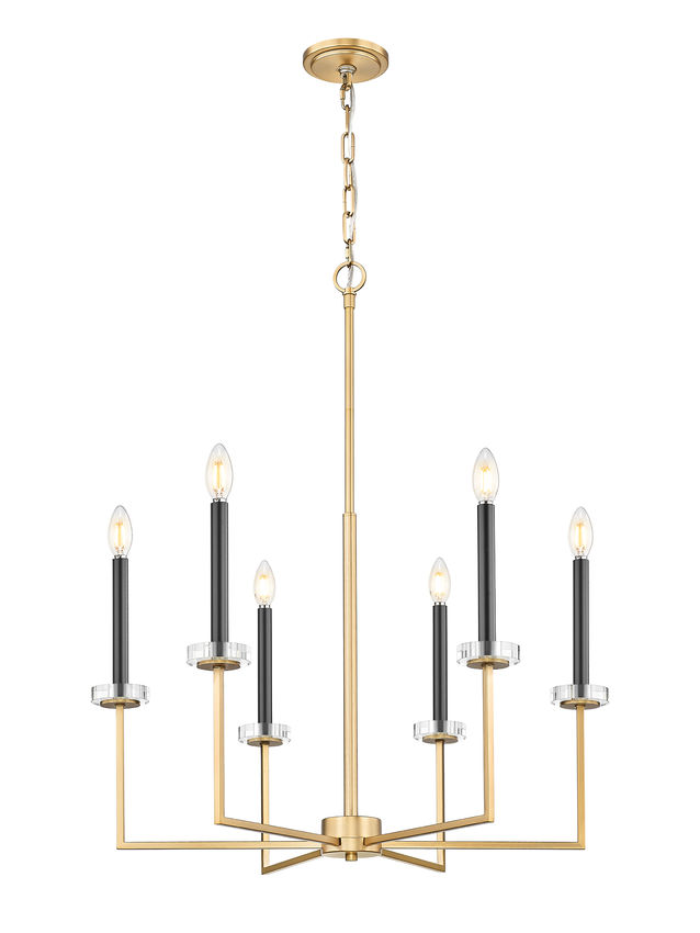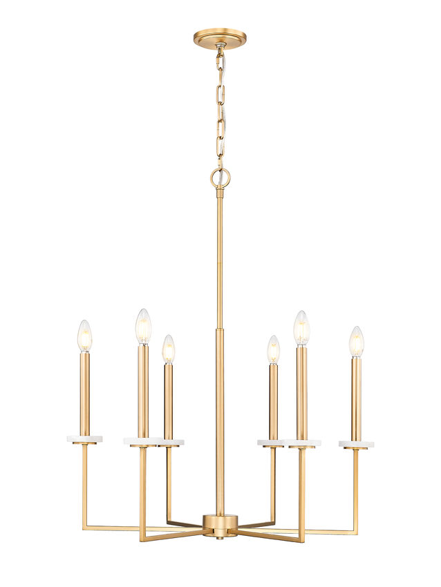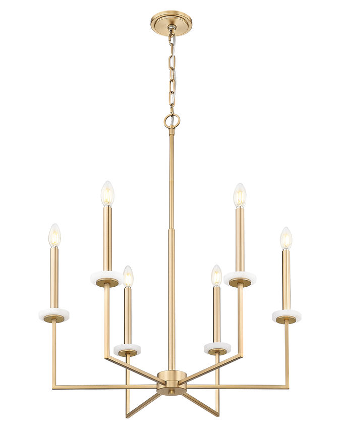 Working geometric silhouetting into a beautifully romantic motif is a statement-making quality of this modern gold finish steel six-light chandelier. Angles and lines play well together, with romantic torch sleeves and candelabra bulb mounts conjuring a village feel. Decorative boboches bring surprising and unanticipated organic flavor to a fixture offering dimming features with varying light levels.