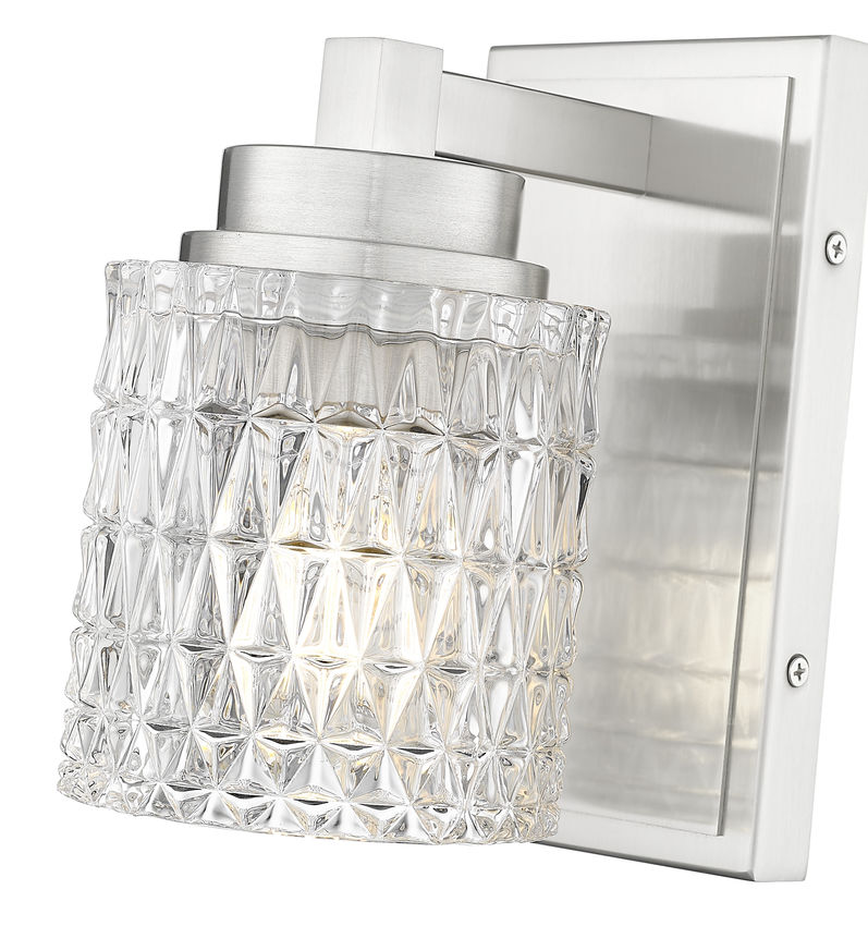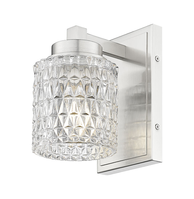 Textural elegance shows up in the diamond patterning of this wall sconce, adding glam style to a timeless design. Its clear glass shade and brushed nickel finish steel frame result in a classic look of sophistication, an excellent way to complement upscale living room, hallways, and bedroom spaces. Use dimming functions to introduce variable levels of soft illumination.