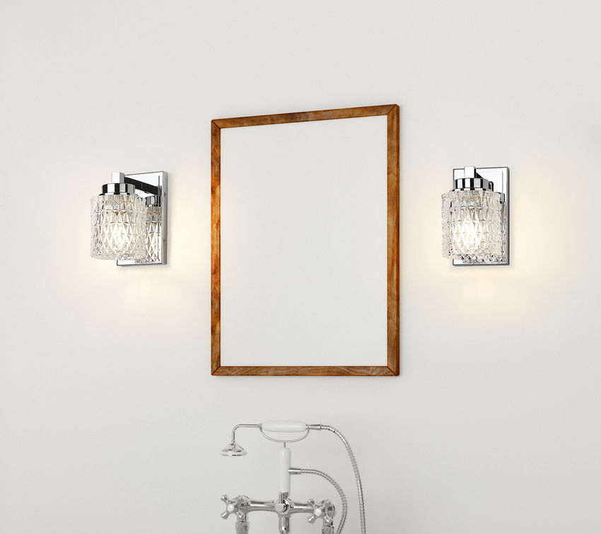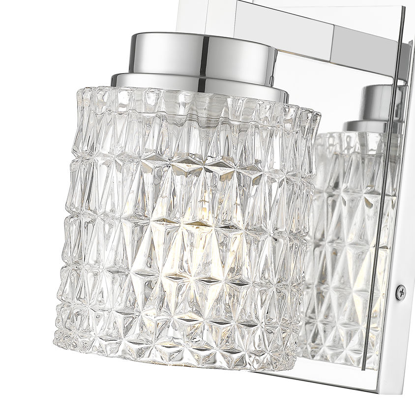 The brilliance of chrome finish steel radiates as it provides an anchor to this glam-inspired single light wall sconce, a superb choice mixing timeless style with an upscale motif. Fitted with a clear glass shade featuring textural diamond patterning, this dimmable light fixture becomes a go-to option for living rooms, hallways, and bedrooms.