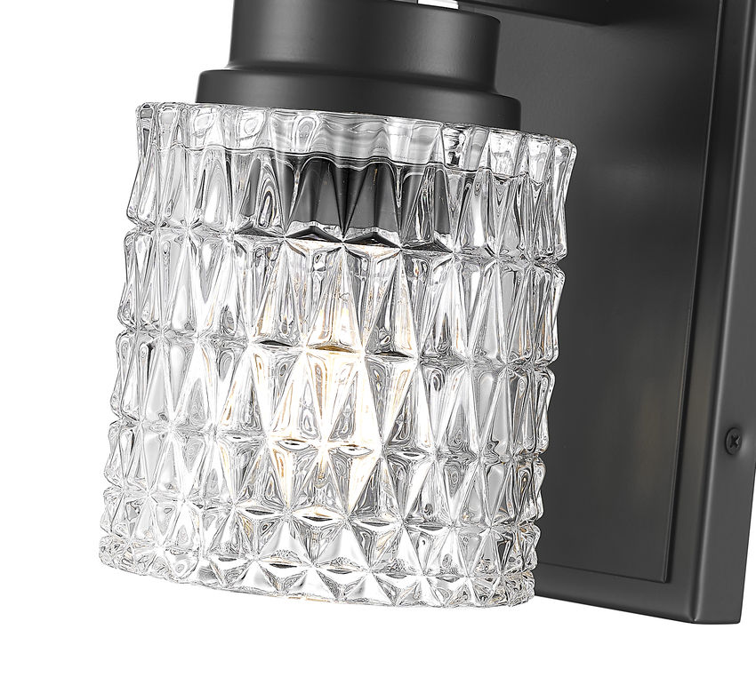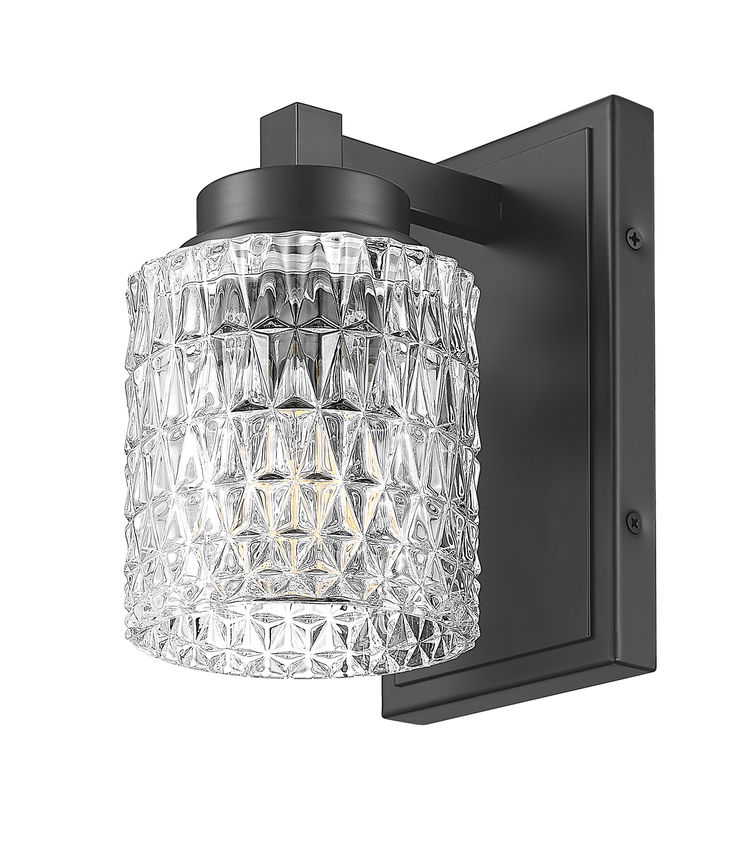 This glam one-light wall sconce offers a dramatic palette contrast, with matte black finish steel framing cuddling a textural diamond patterned cylinder clear glass shade. Subtle design details offer versatility, ideal for ever-changing room styles. Dimmable lighting adds variable levels of illumination for mood lighting or time-of-day conditions.