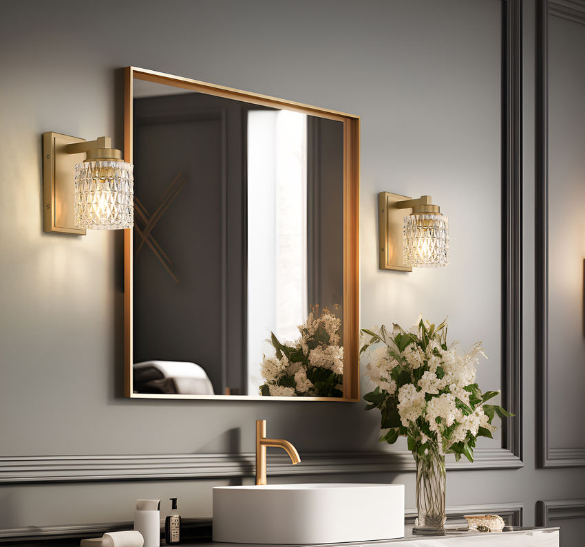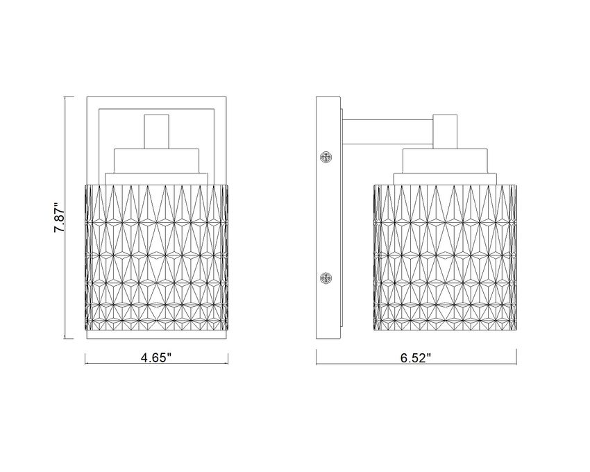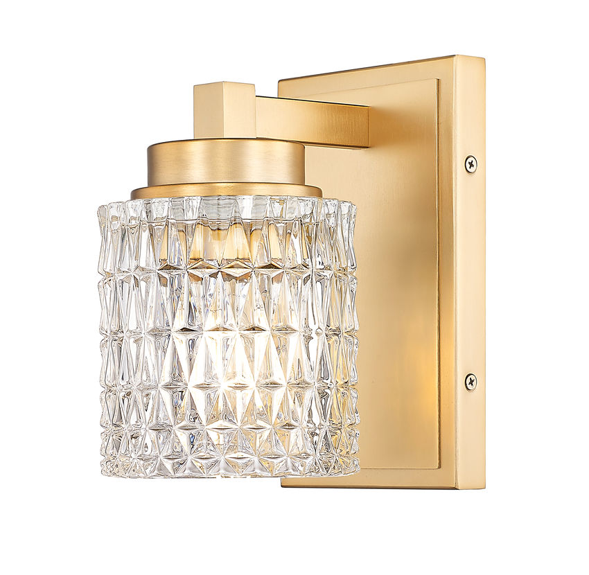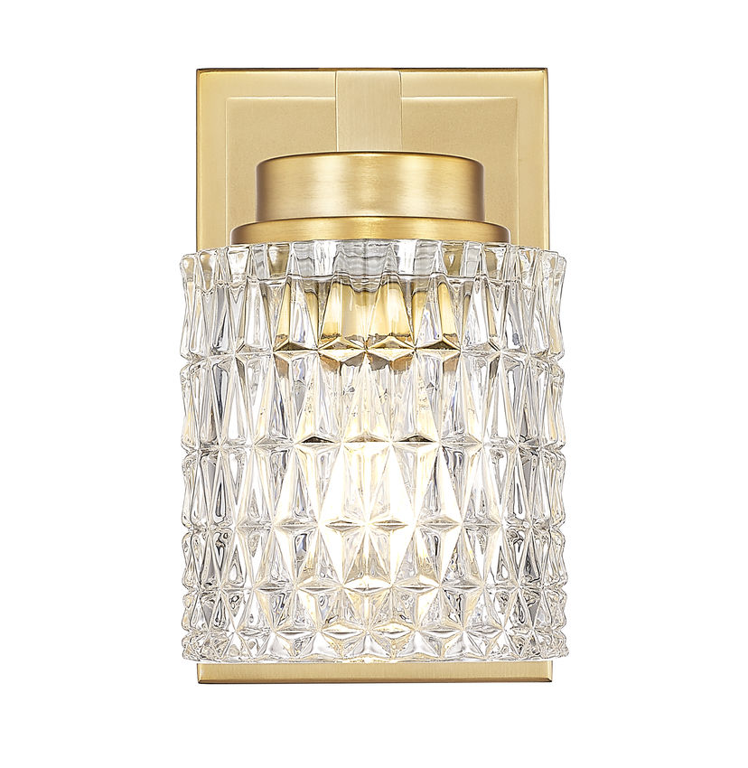Sparkling clear glass embossed with diamond patterning offers a focal point for this tasteful one-light wall sconce, perfect for sealing the decadent sophistication in any space. Warm modern gold finish steel framing features subtle detail that suits custom living rooms, bathrooms, and hallways, with dimmable lighting levels offering mood illumination.