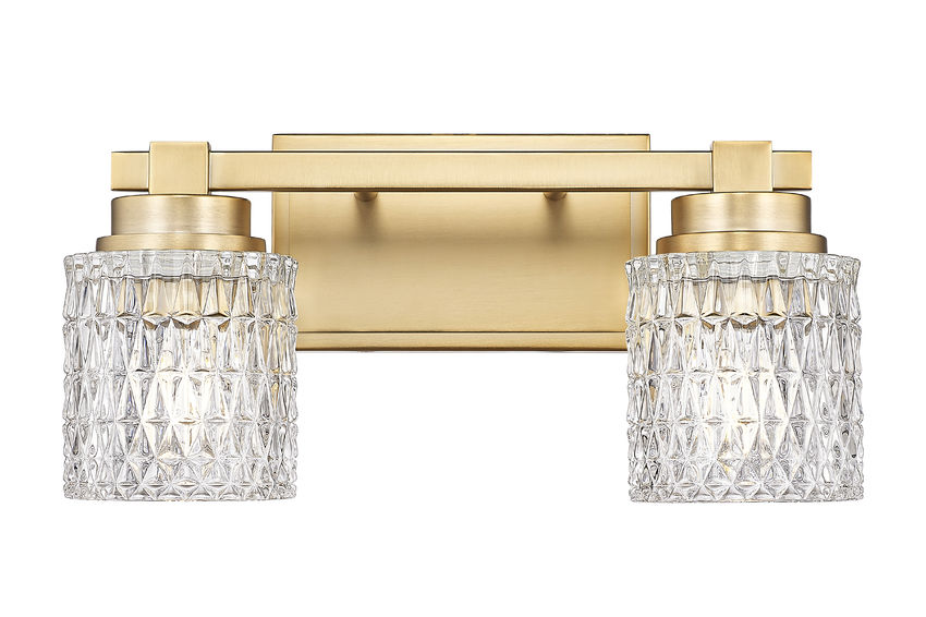 In the spirit of glam warmth, this modern two-light vanity offers radiant elements beginning with a modern gold finish steel frame. Decadently textural diamond patterning on thick, clear glass shades adds a sense of elegance, perfect for master and guest bath spaces as well as other outer living areas. With dimming features, variable light levels deliver both mood lighting and functional customization.