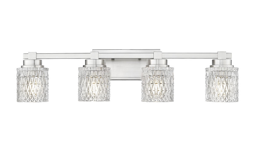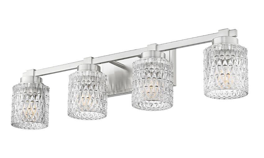 Perfect for larger bath spaces, this four-light vanity fixture ensures a timeless look of sophistication. Subtle detail enriches its brushed nickel finish steel framing, with textural beauty playing up the glam style of diamond patterning on clear glass shades. Use dimming features to alter light levels that reflect day-to-night illumination needs.