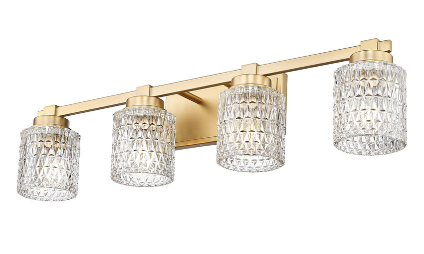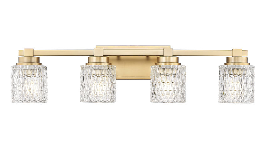 Emulate the look of fine glassware with a four-light vanity fixture noted for its clear glass diamond patterning on cylinder shades. Along with beautiful modern gold finish steel framing, this light is an excellent way to provide timeless style in master or guest bathrooms. Dimming functions create variable light levels, both for mood effects and to meet time-of-day conditions.