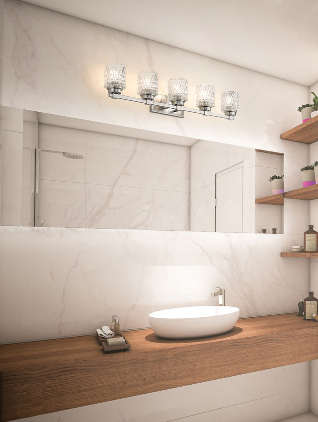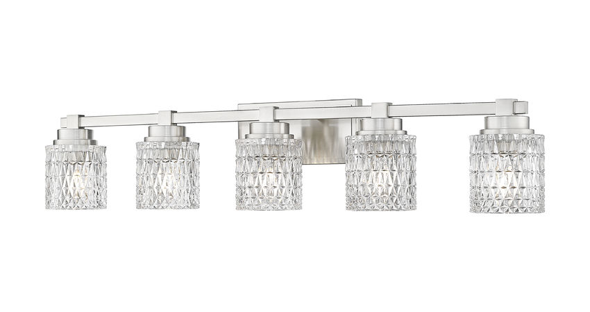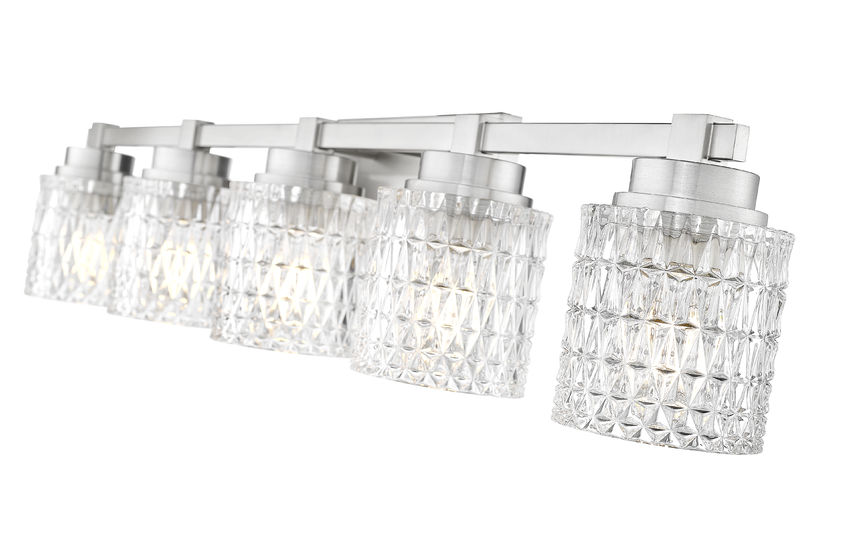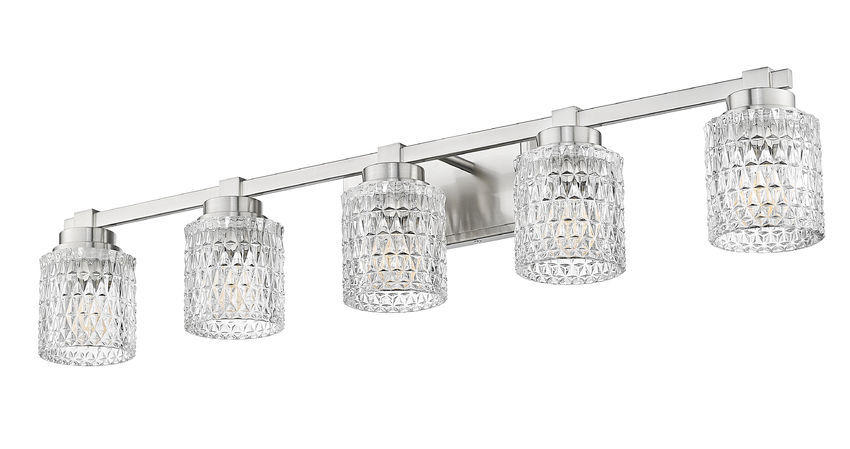 Texture and artistry team up to produce tasteful glam in a five-light vanity fixture perfect for larger master and guest bath settings. You'll love the subtle yet sophisticated detailing on its brushed nickel finish steel framing, with textural clear glass shades showing off precision diamond patterning. This dimmable light fixture blends aesthetics with function to suit the needs of custom living areas.