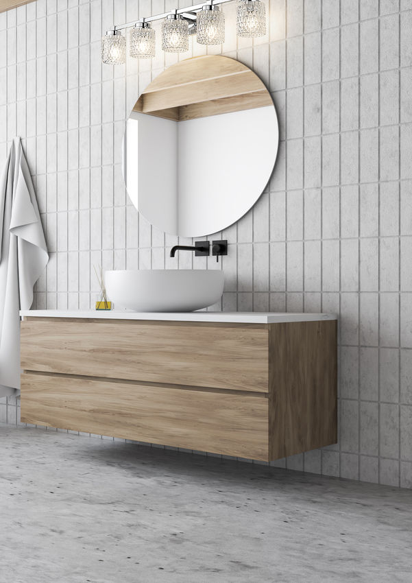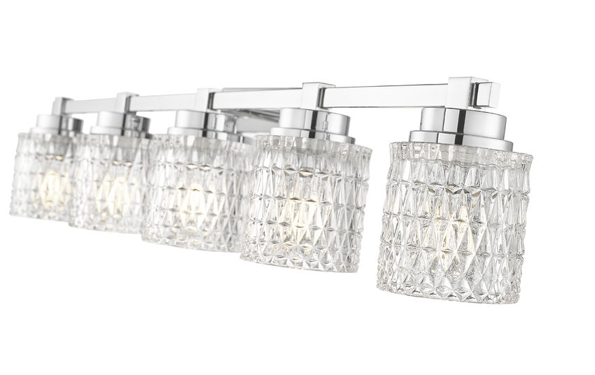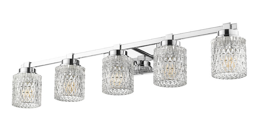 Make a statement in an elegant bath space with a five-light vanity light featuring a brilliant chrome finish steel frame heightened by subtle yet stylish detail. Offering plenty of ambient light over vanity spaces, this fixture features art-inspired diamond patterning over clear glass shades, easy on the eyes and adding a chic filter impact. Dim this light fixture to customize the level of illumination for various times of day and mood lighting.