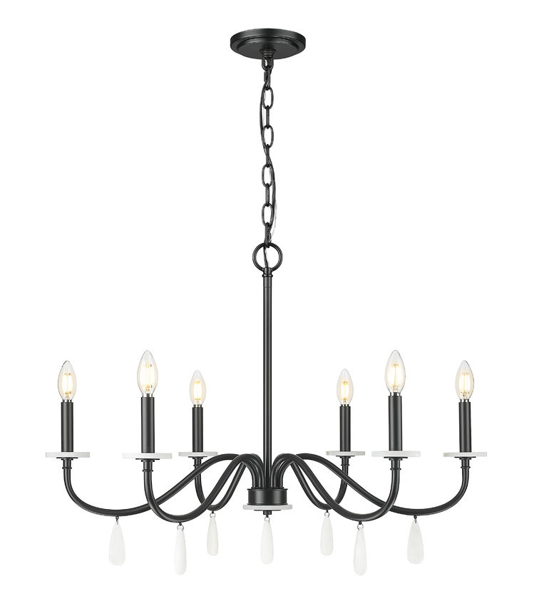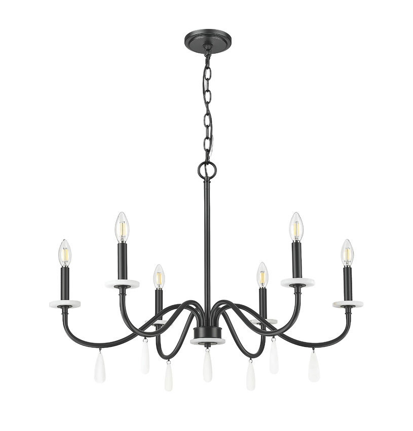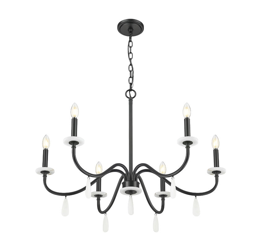 Romantic candle sleeve holders infuse a sense of romance to this elegant six-light chandelier, a superb source of illumination perfect for dining rooms, living rooms, and foyers. Follow the gentle curves of matte black finish steel arms with alabaster boboches making an impact, with artisan droplets sparkling below. This dimmable fixture adjusts light levels to suit time-of-day conditions.