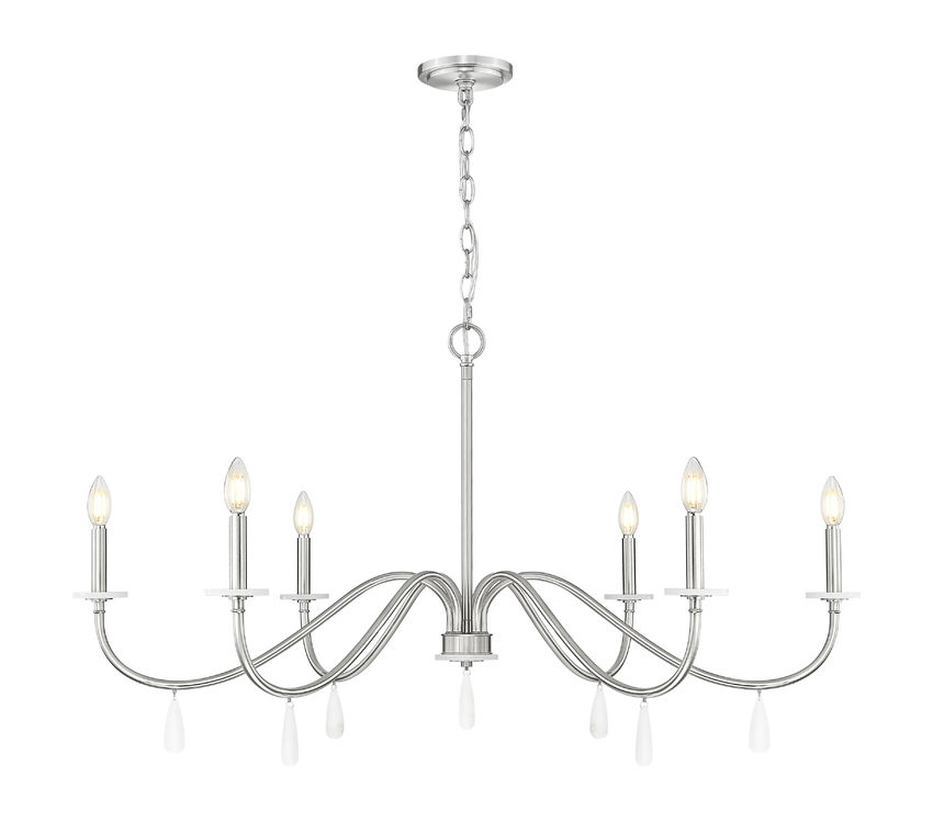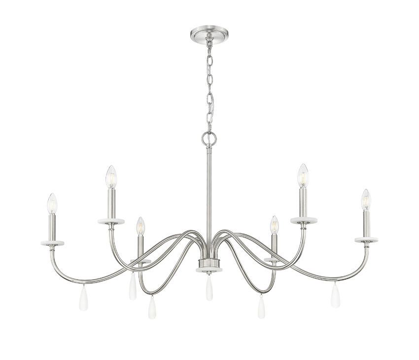 The presence of decorative drop elements brings a romantic feel to this six-light chandelier, an excellent choice for illuminating dining spaces, living rooms, and foyers. Classic, timeless style is versatile with brushed nickel finish steel framing and cable suspension, as ornate boboches under torch sleeves make room for your choice of separately purchased bulbs. Alluringly curved arms form an eye-pleasing silhouette making a statement in any space, as dimmable features allow for varying light levels.