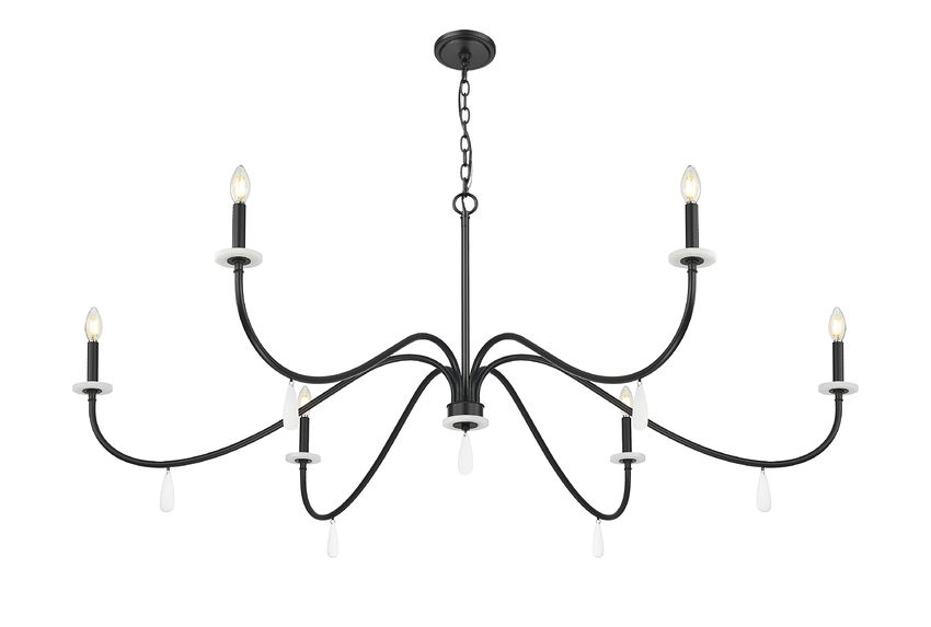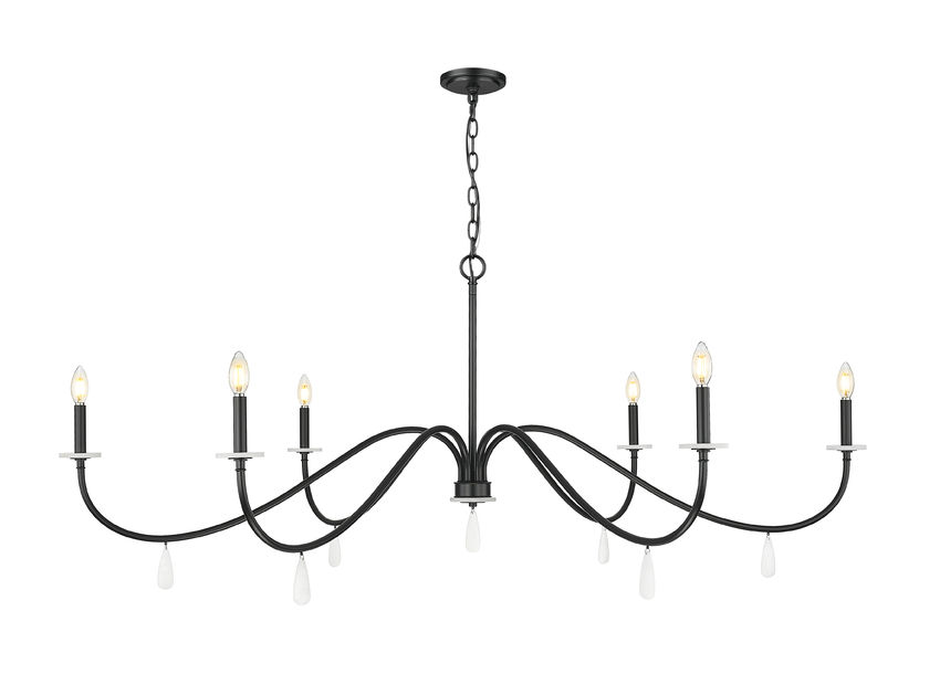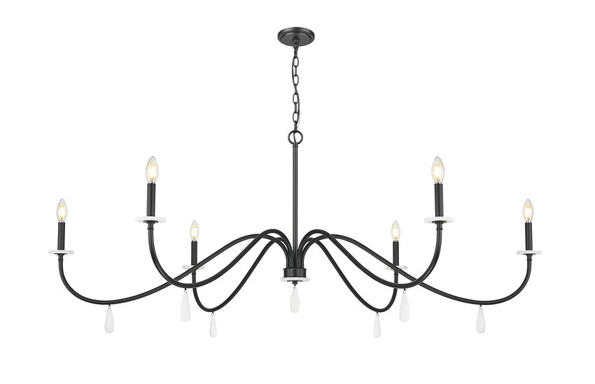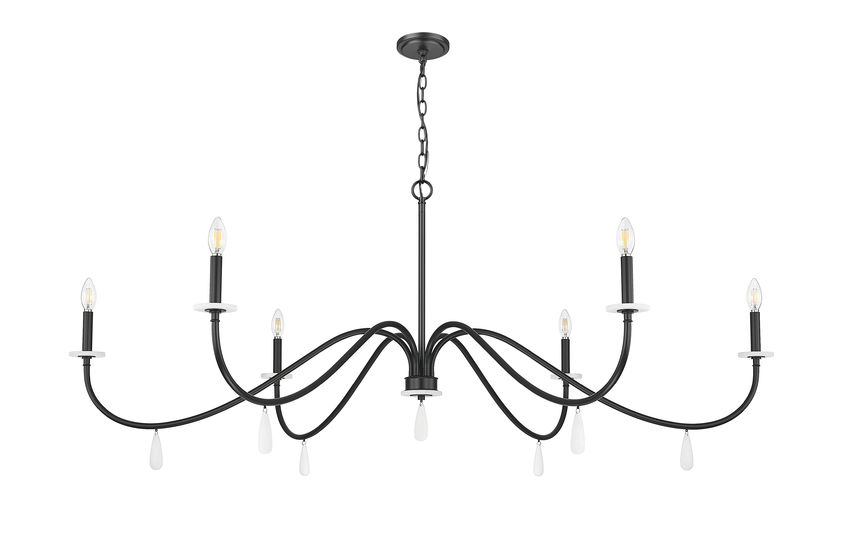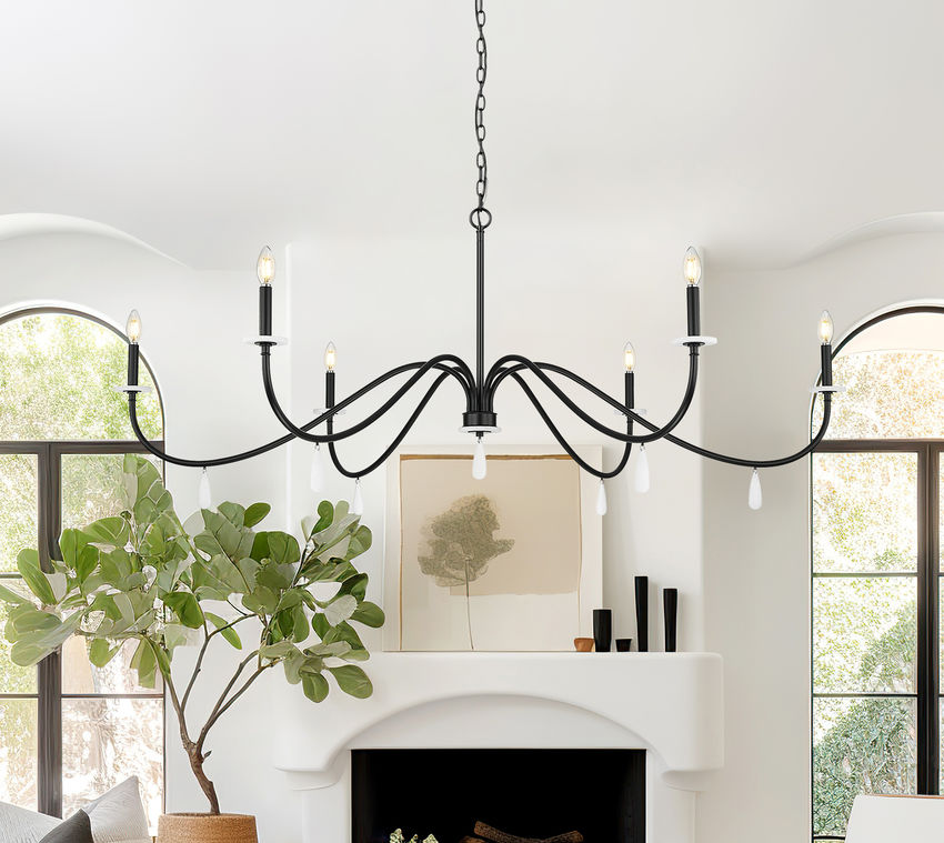 Dramatic and bold matte black finish steel creates a tasteful look of sophistication in a timeless six-light chandelier you'll love over a dining ensemble or in a foyer. Simplicity becomes eye-catching with gracefully curved arms capped with torch sleeves and alabaster bobeches, highlighted with dangling artisan elements. Enjoy varying light levels made possible with dimming functions.