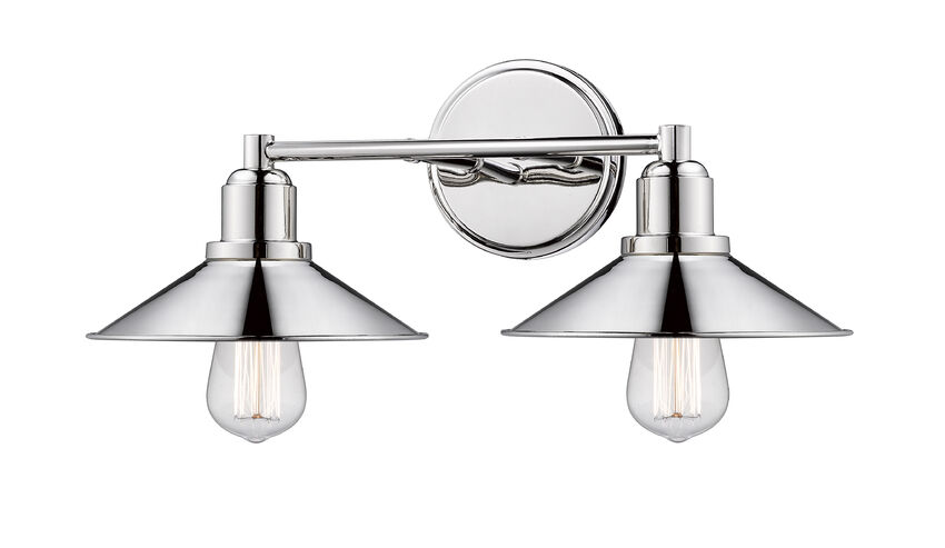 An enticing polished nickel finish stands out in this two-light vanity fixture, a perfect addition to a custom designed master or guest bath space. A pair of hood shades and a wall mount made from steel pair nicely with charming vintage bulbs, creating a fluid look.