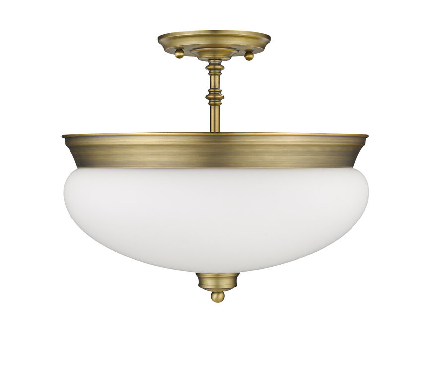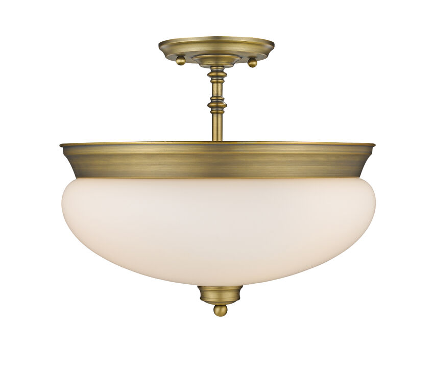 Bold clean lines play beautifully with a traditional schoolhouse silhouette in this three-light semi flush mount lighting fixture. The rich heritage brass complements a classic look while the matte opal rustic inspired shades have a charming rustic style.