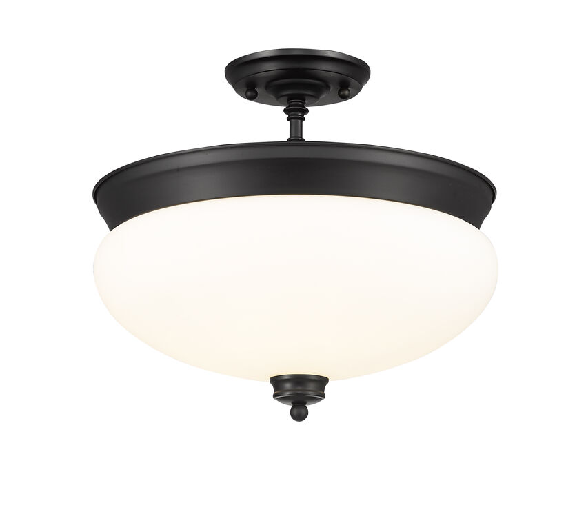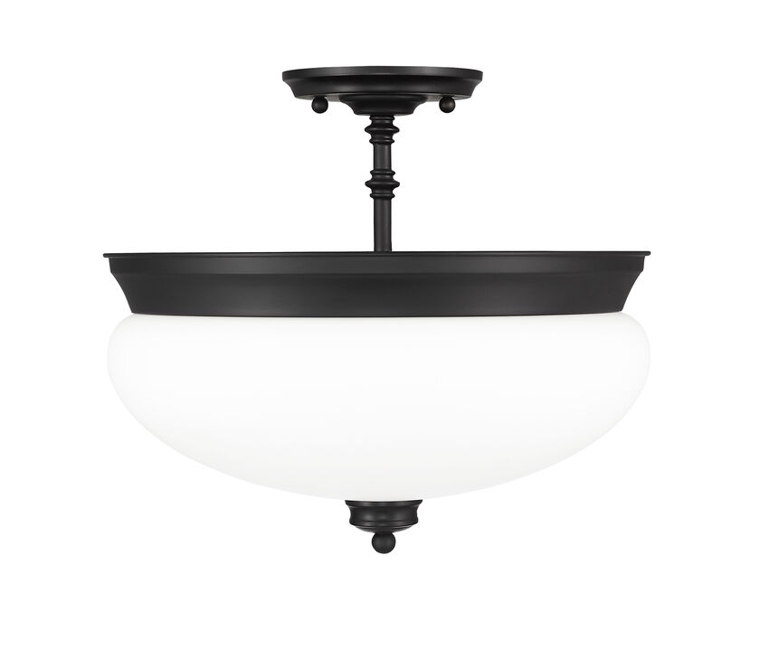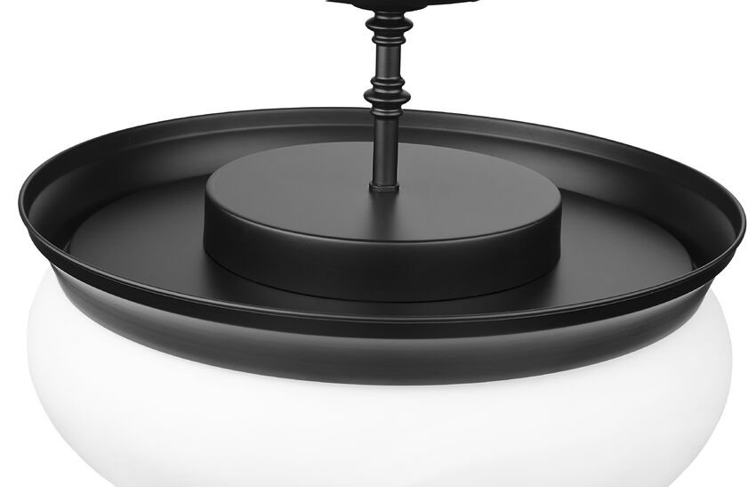 Building on an iconic schoolhouse theme, this three-light semi-flush mount ceiling light offers a stylish source of illumination for a transitional space. Presenting a gorgeous contrast and ornate detailing, its Matte Black finish metal accents make a Matte Opal dome shade appeal to the romantic at heart.