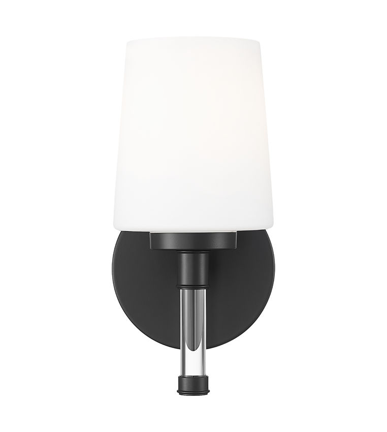 Defined in a deep inky finish, this matte black one-light vanity light brings striking contrast to light tile and paint, outlining the vanity area with a clear, confident gesture. The crystal detail and opal shade keep the piece from feeling heavy, allowing the light to glow softly while still staying bright enough for detailed tasks. In a family bath, loft apartment, or streamlined powder room, this character-rich fixture helps the whole space feel more intentional and contemporary.