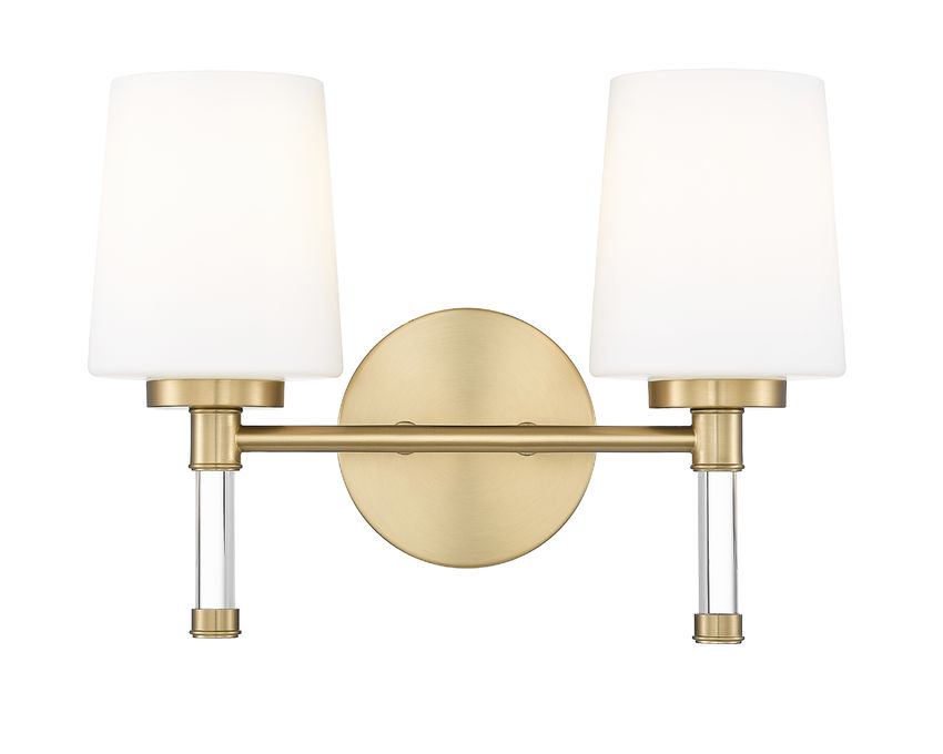 Softly brushed metal finishes lend this modern gold two-light vanity light a warm, sunlit character that flatters tile, stone, and paint alike. The pair of opal glass shades glow like small lanterns, sending an inviting light across the sink that feels especially welcoming in guest baths or a dressing nook. Paired with warm hardware and plush towels, this graceful fixture helps the room feel collected, gracious, and ready for everyday rituals or special evenings.