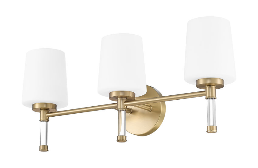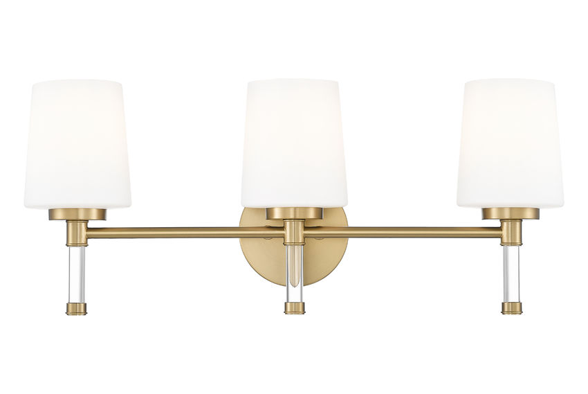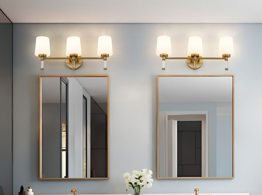 Glowing with warmth, this modern gold three-light vanity light turns the mirror wall into a softly luminous backdrop for morning coffee and evening skincare. Used above a double sink or long console, this elegant piece gathers the whole space together into a welcoming, warm, and subtly luxurious space.