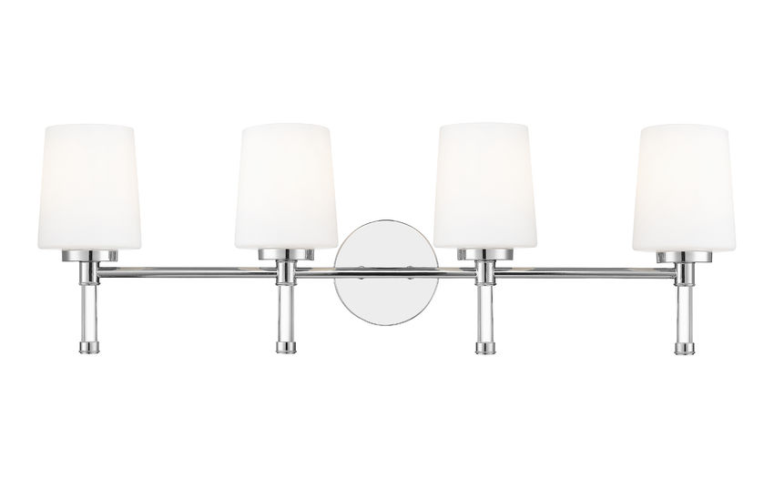 Full of sparkle, this chrome four-light vanity light brings a lively, reflective energy to larger bathrooms, echoing water, tile, and mirror with its gleaming surface. Mounted over a long vanity or recessed niche, this striking piece makes the entire wall feel purposeful and chic.