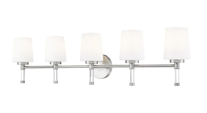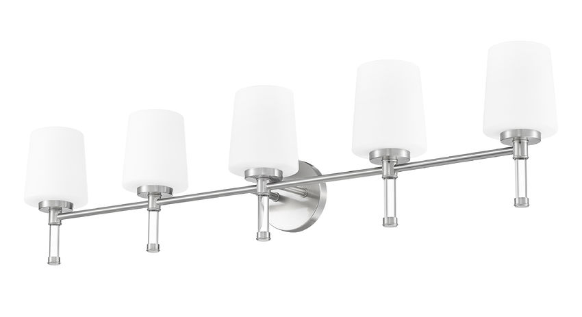 Lined up like a row of candles, five opal shades on brushed nickel give the mirror wall a gracious, expansive glow that feels right at home in a spacious primary bath. Stretching confidently across double sinks or long counters, this brushed nickel five-light vanity light keeps the space consistently lit for mornings that start early and evenings that end late.