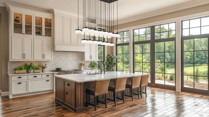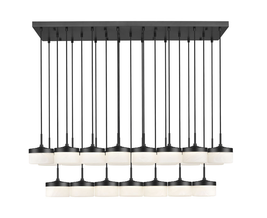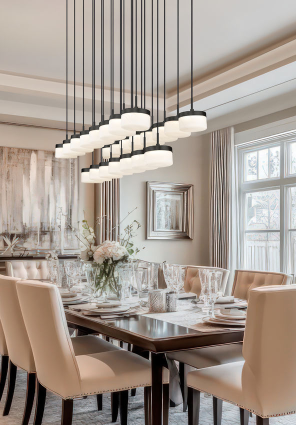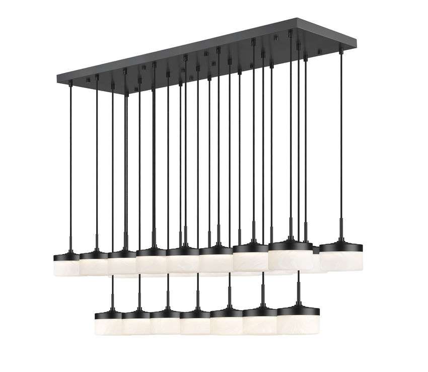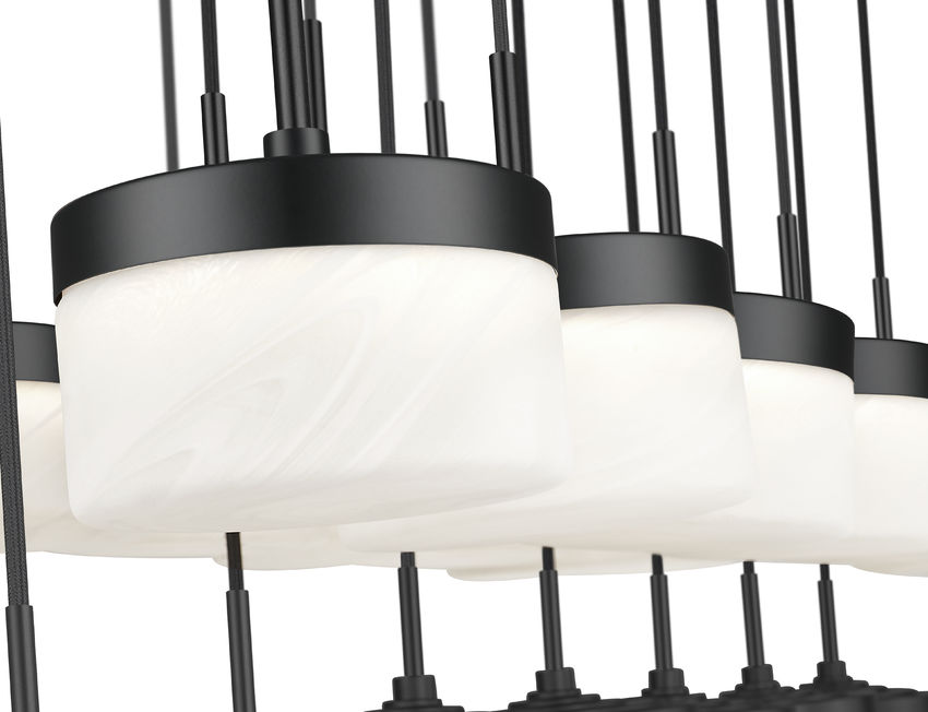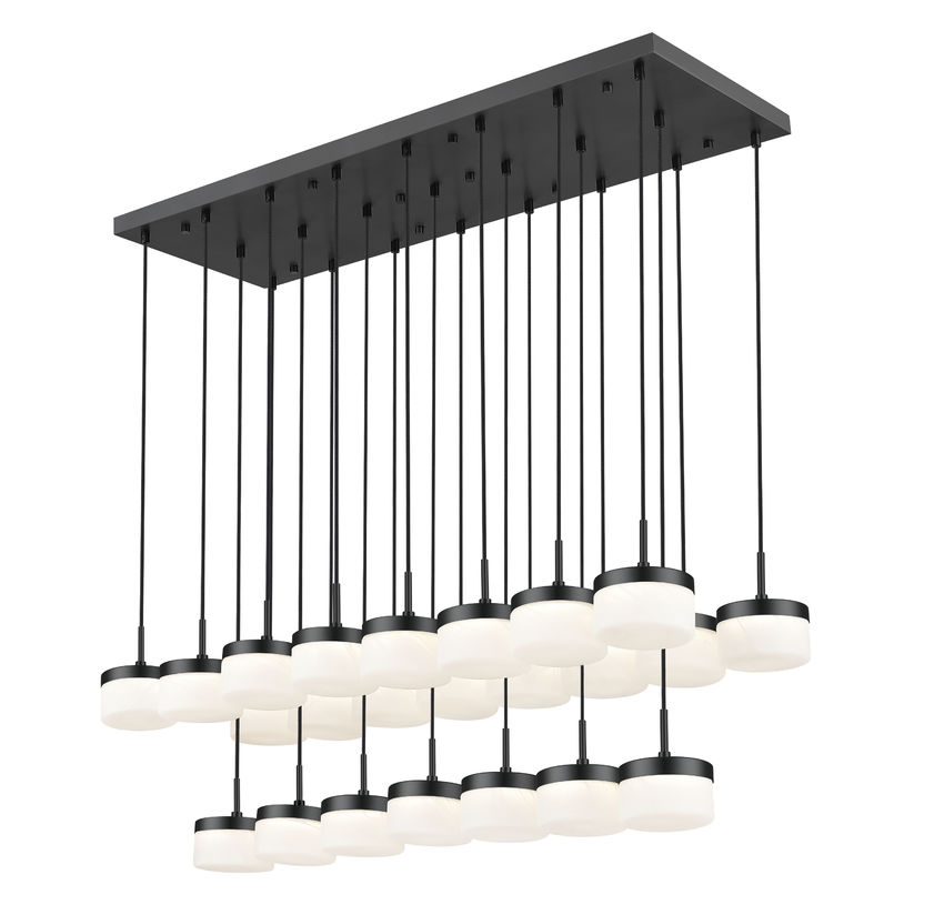 Along its deep inky frame, this matte black 23-light linear LED chandelier lines up glowing glass shades that appear to float in midair across the room. The generous spread of light easily covers long islands, conference tables, or extended dining setups so every seat feels included in the glow.