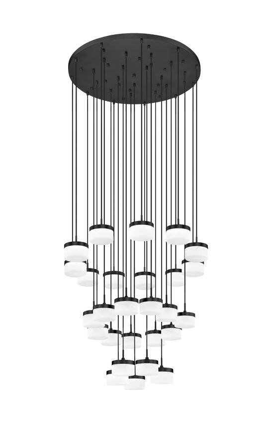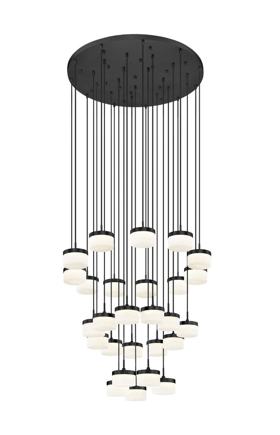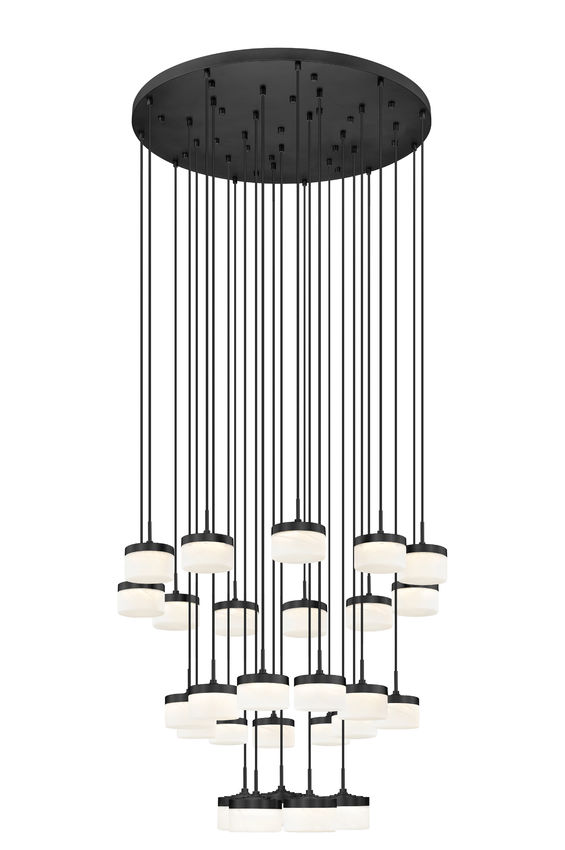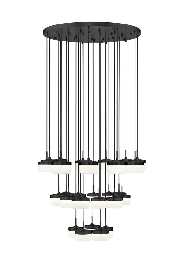 From a broad round canopy high above, this matte black 27-light LED chandelier releases slender cables to a cascade of clouded glass disks that seem to hover in space. The layered heights and generous lumen output suit double-height foyers and stairwells where you want impressive sparkle along with reliable illumination. Viewed from below or from an upper landing, the composition feels dynamic and refined, turning an everyday circulation space into a place people stop to look up.
