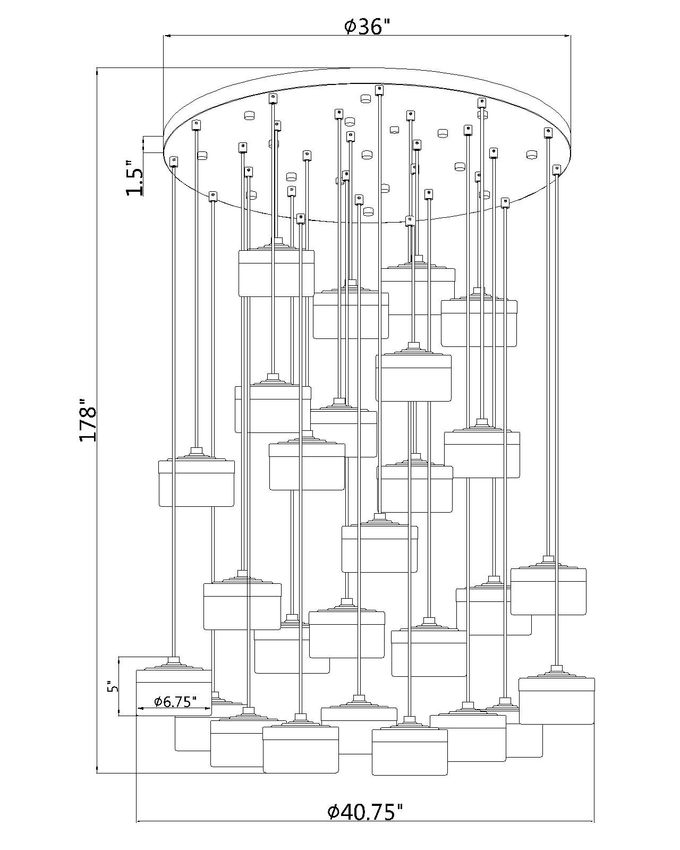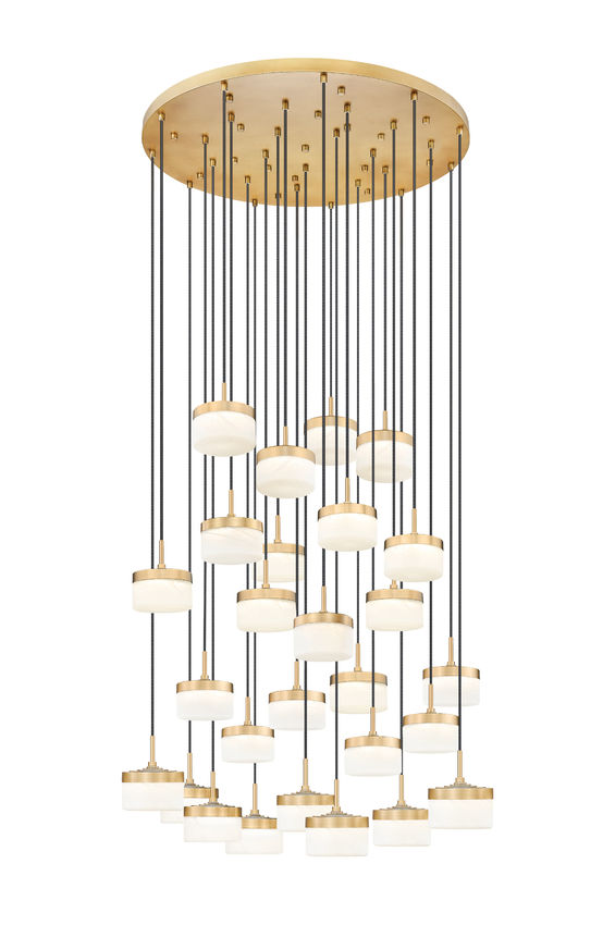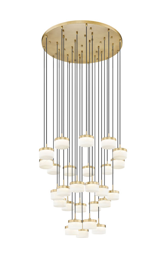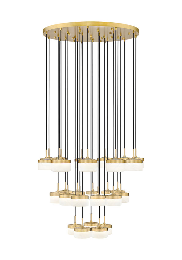 Glimmering in brushed metal, this modern gold 27-light LED chandelier drops a constellation of frosted cloud shades that fill tall rooms with a soft, radiant presence. The generous scale and adjustable cords make it easy to tailor the arrangement for grand entries, stair halls, or great rooms so each level of the home feels connected by light. As it shifts from bright daytime clarity to a mellow evening setting, it becomes a luminous centerpiece that signals arrival, welcome, and celebration.