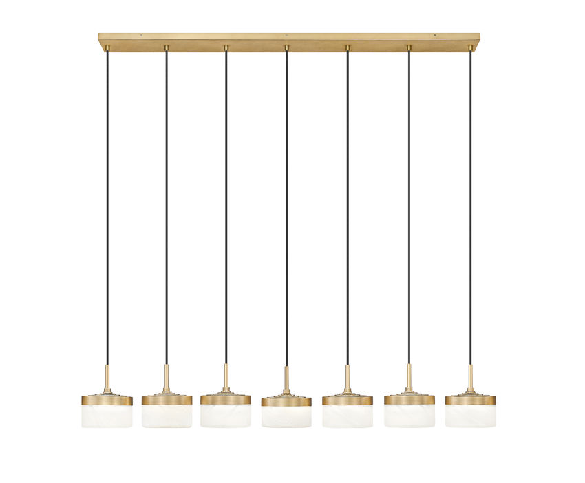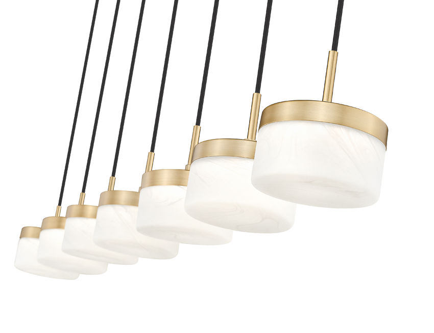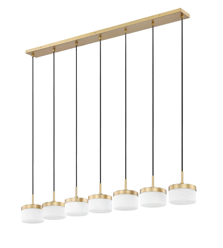 Along a warm satin rail, this modern gold 7-light linear LED chandelier stretches gracefully above the table, its slender cords and frosted cloud shades creating a refined band of light that feels both modern and welcoming. When dimmed for late-night drinks or brunch on a sleepy weekend, it settles into a soft glow that gives the whole room an easy, friendly atmosphere.