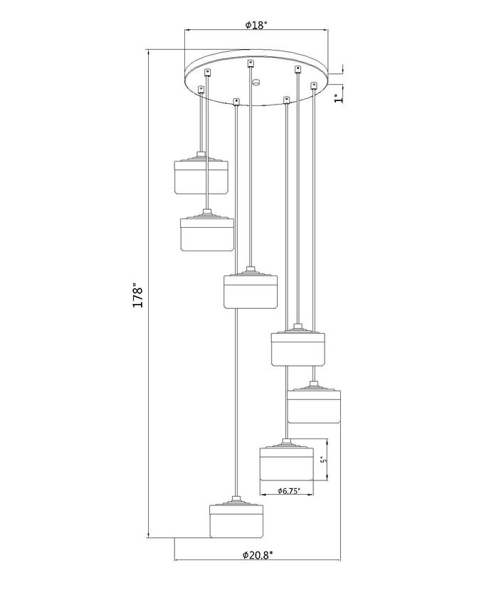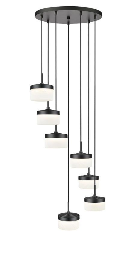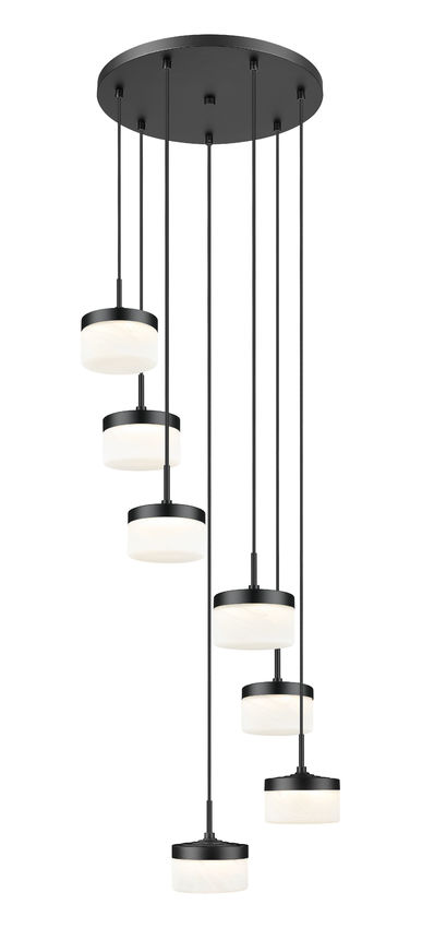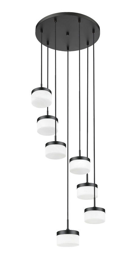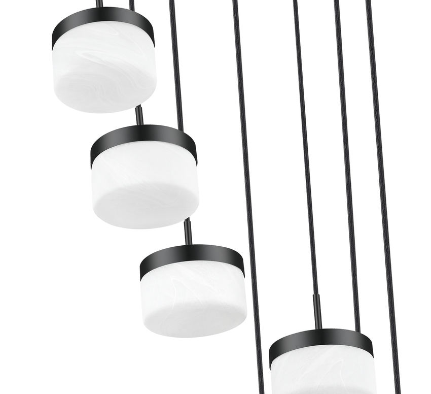 Suspended from a round canopy, this matte black 7-light LED chandelier lets its clouded glass shades fall in a gentle stagger, turning a tall foyer or stairwell into a place people naturally pause to look up. The deep frame outlines the composition with just enough contrast that the bright, feathered glass stays the star while still coordinating with dark hardware and interior accents.