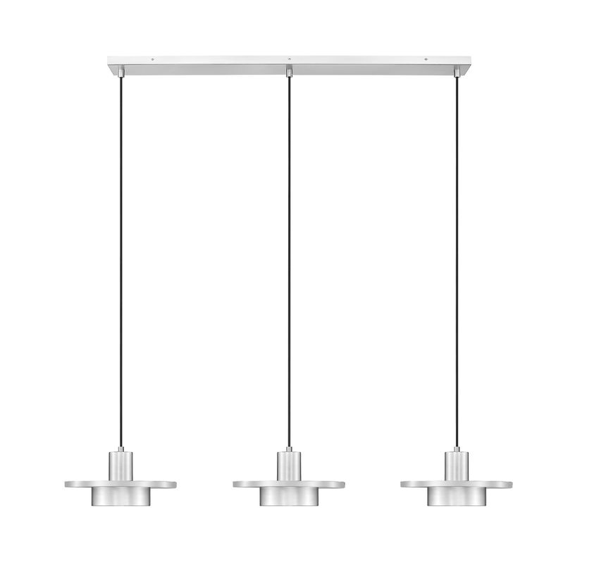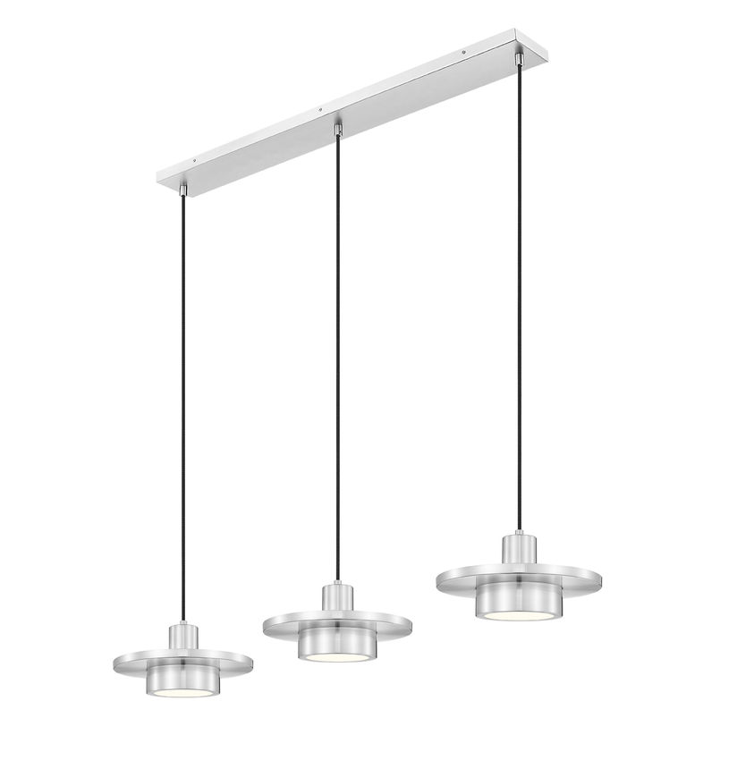 A softened geometric silhouette plays nicely in a set of linear pendants, offering a mix of old and new aesthetics perfect for casual settings. Brushed nickel finish steel construction creates a simple luminaire with cylinders and a center disk, as a bold black cable provides perfect contrast. Illuminate a counter, hall, or other linear space with dimmable LED lighting flowing through this three light fixture with frosted acrylic diffusers.