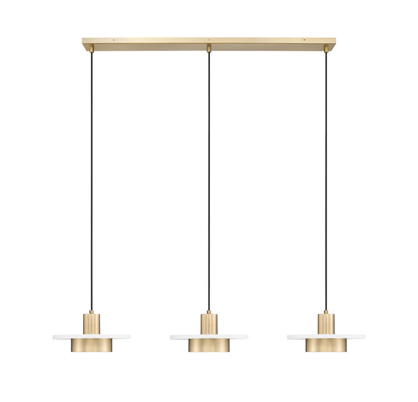 Charming luminaires collect in a linear, staggered arrangement, making this stylish three-light linear chandelier a great option for illuminating horizontally oriented settings. Warm any space with a delightful fixture featuring modern gold finish two-part luminaires matching a long, slender canopy, as black cords bring a color update. Frosted acrylic shades diffuse LED lighting with dimming features to create mood lighting.
