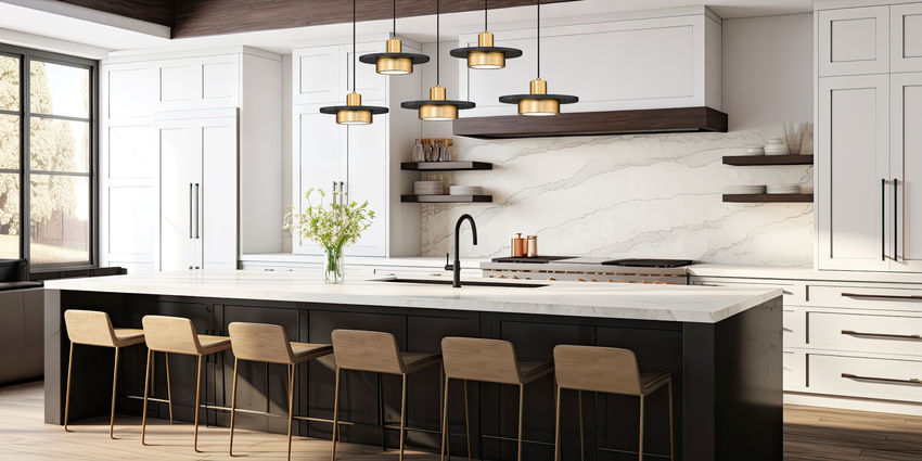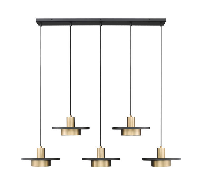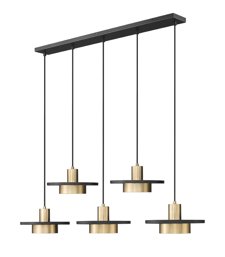 An aesthetically charming look appeals to geometric shaping in a five-light linear chandelier ideal for casual settings. Staggered rows of modern gold finish luminaires combine basic shades on holders sandwiching matte black disk elements, creating an iconic palette. Highlight horizontally oriented islands and other venues with a catchy multi-light LED fixture offering mood-altering dimmable lighting.