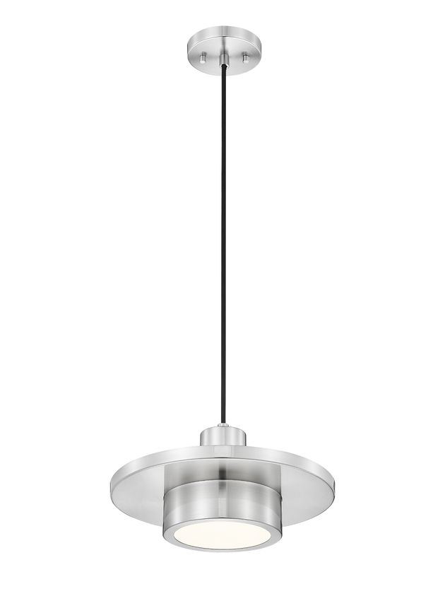 A softened geometric silhouette plays nicely in a single-light pendant, offering a mix of old and new aesthetics perfect for casual settings. Brushed nickel finish steel construction creates a simple luminaire with cylinders and a center disk, as a bold black cable provides perfect contrast. Illuminate a corner or nook space with dimmable LED lighting flowing through a frosted acrylic diffuser.