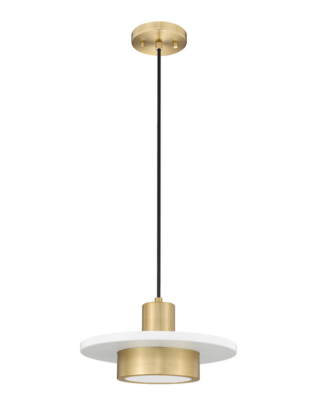 Keeping it simple, this art deco inspired one-light pendant leans on a geometric silhouette with cylinder shapes intersected by a matte white disc for good measure. Modern gold finish steel construction includes a round canopy, with a bold black suspension cord offering dimensional quality. Take advantage of dimmable LED illumination flowing through a frosted acrylic glass shade.