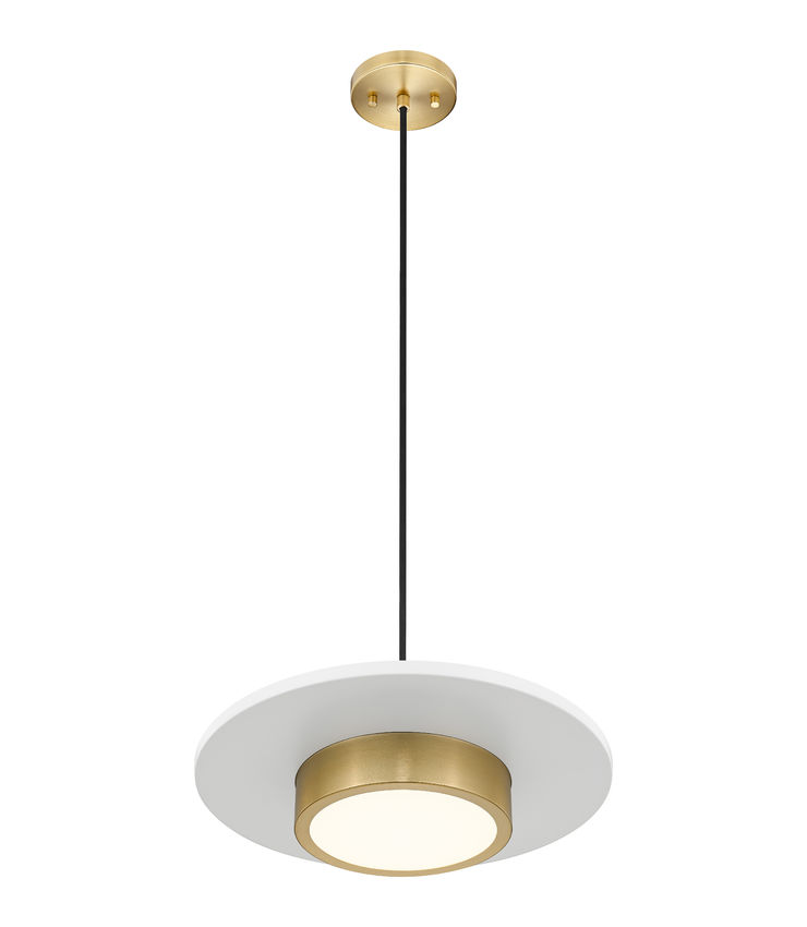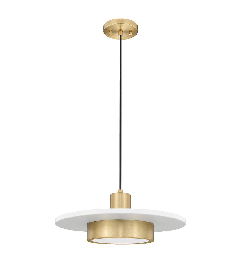 Amazing with a mix of simplicity and iconic retro style, this one-light pendant light makes a difference in living rooms, hallways, and bedrooms. Modern gold finish steel framing combines various sizes of cylinder elements interrupted by a charming matte white disc and suspended with a bold black cord. Dimmable LED lighting shines through a frosted acrylic shade, creating options for varying light levels to suit a range of lighting needs.