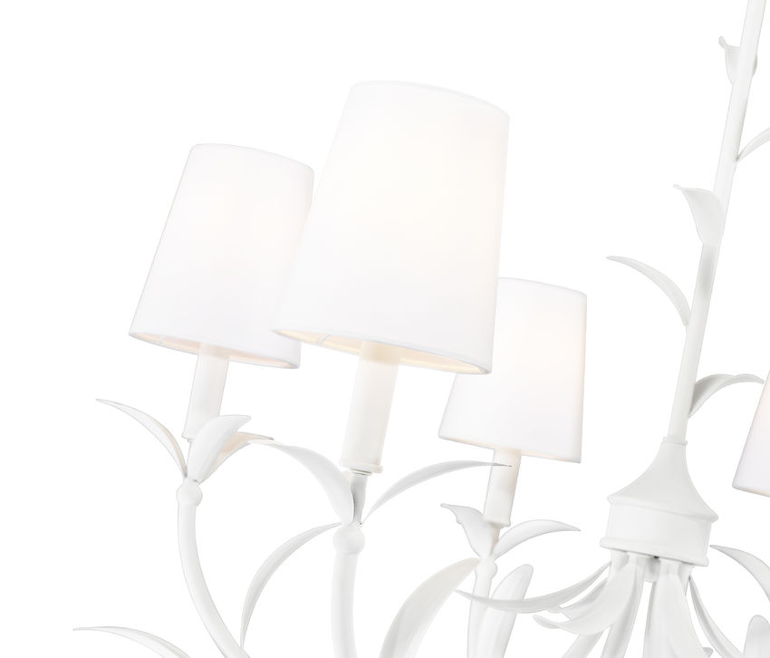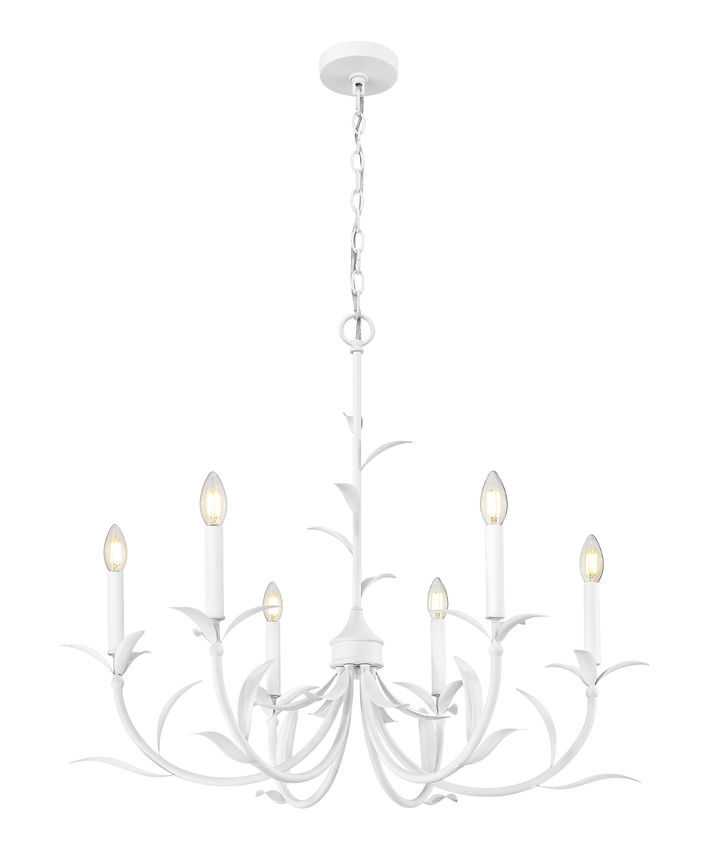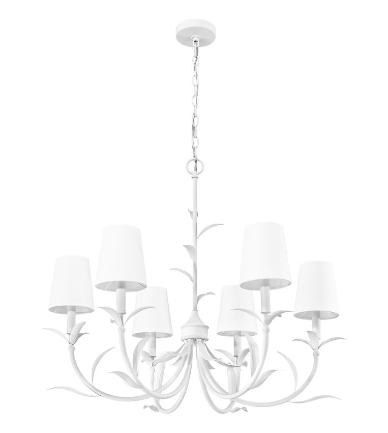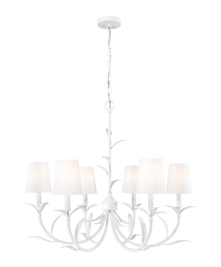 Soft textured white finish steel framing offers an elegant look to this six-light botanical chandelier, perfect for embracing a natural motif in dining rooms, foyers, and bedrooms. Curved arms with delicately shaped fronds invite a luxe look, with smooth holders and candelabra-style bulb mounts paving the way for dimming options that deliver mood lighting.